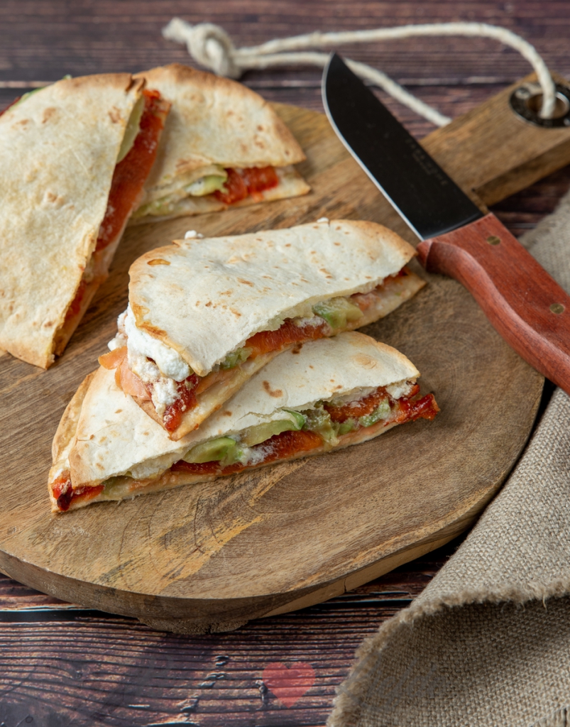Dit recept voor West Coast British Columbia style gerookte zalm quesadilla’s kreeg ik onlangs doorgestuurd van mijn Canadese nicht Marissa. Canadezen zijn dol op zalm en het is daar een veelgebruikt ingrediënt. In dit heerlijke recept gaat de gerookte zalm in een quesadilla samen met geroosterde paprika, avocado en geitenkaas. Een verrukkelijke combi! Mijn nicht bereid de quesadilla’s op de barbecue, maar je kunt ze ook grillen in de grillpan of roosteren onder een hete ovengrill.