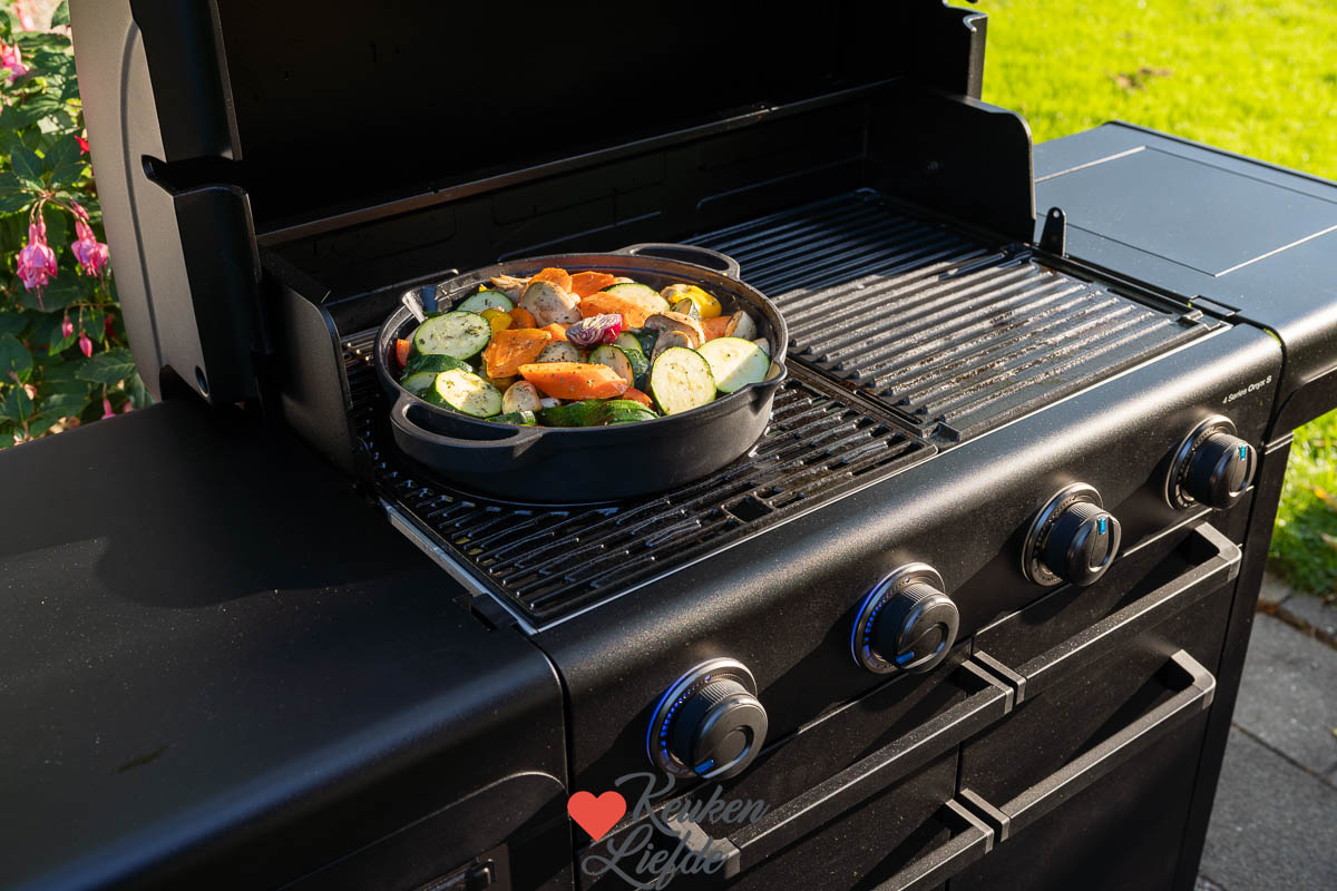 De braadpan met de groenten bereiden we op de Campingaz 4 Series Onyx S gasbarbecue. Als je het verwisselbare gietijzeren rooster — Culinary Modular-rooster — eruit haalt krijg je een uitsparing waar je een pan in kunt zetten. Dit keer dus een braadpan met groenten, maar eerder maakte ik ook deze heerlijke recepten: