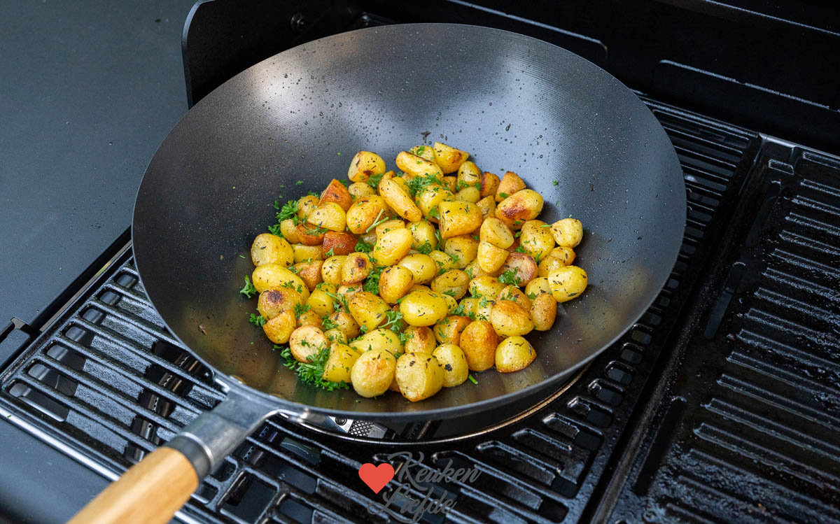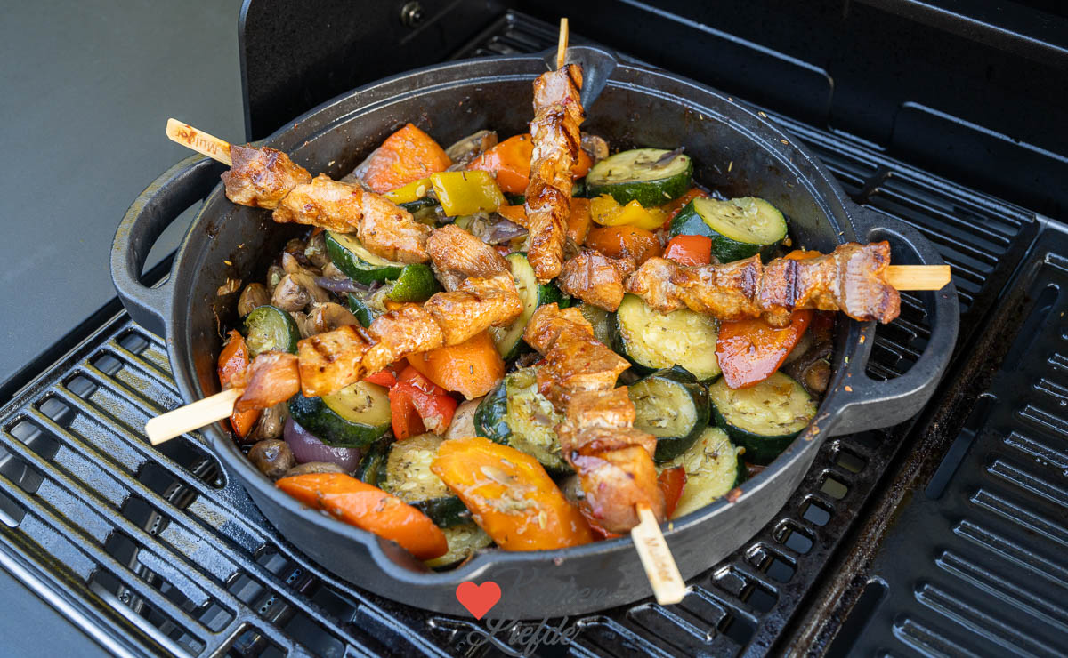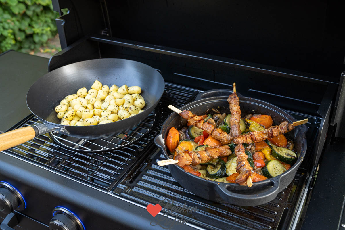 Op de bakplaat naast de skillet kun je bijvoorbeeld wat gemarineerde kipfilets (of kipsateetjes) en krieltjesspiezen bakken voor een volledige maaltijd.