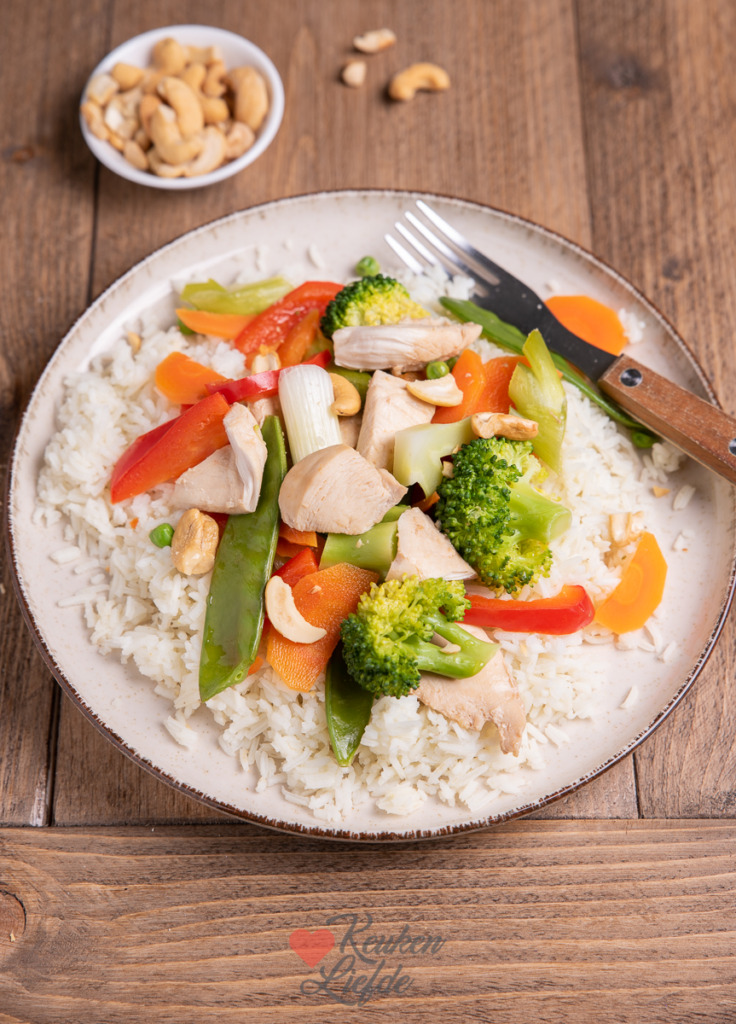Serveer de gestoomde kip en groenten (vergeet het verrukkelijke kookvocht onderin het mandje niet) met rijst en cashewnoten en druppel wat citroensap over je gerecht.