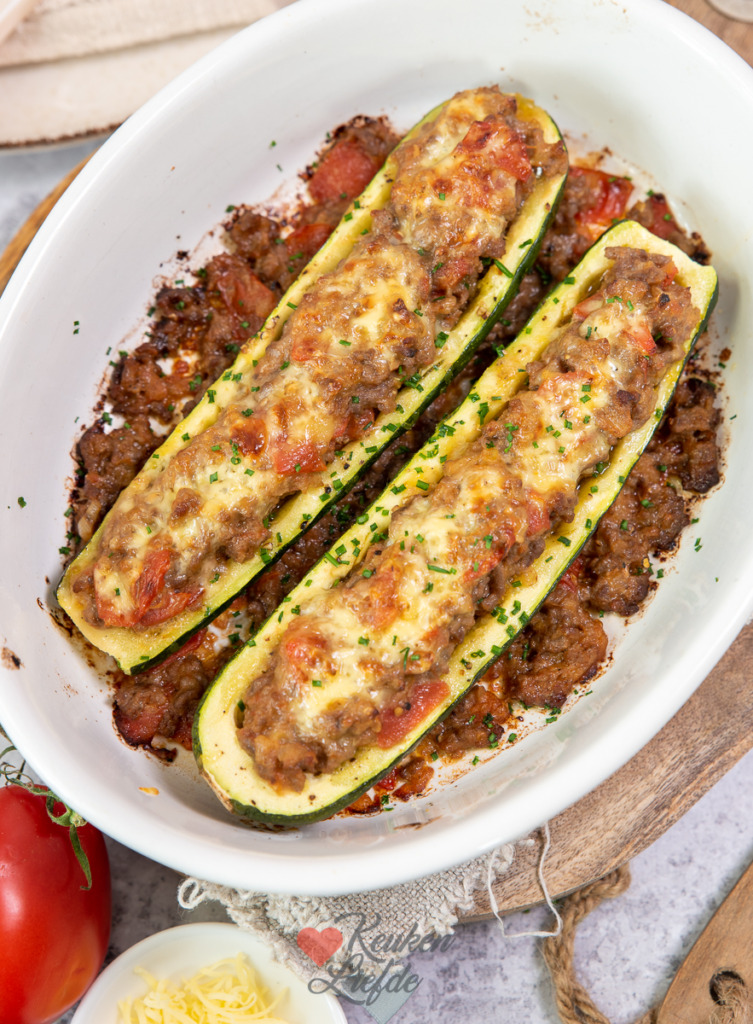 Gevulde courgette met gehakt, tomaat en kaas uit de oven. Een makkelijk en heerlijk recept dat ik vaak in de zomer maak met courgettes uit eigen moestuin. Dit is een koolhydraatarm recept, maar je kunt er ook een aardappeltje, rijst of pasta bij serveren. Ik serveer er graag een lekkere salade bij.