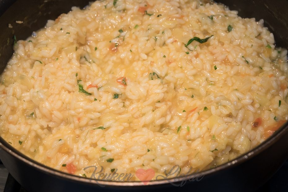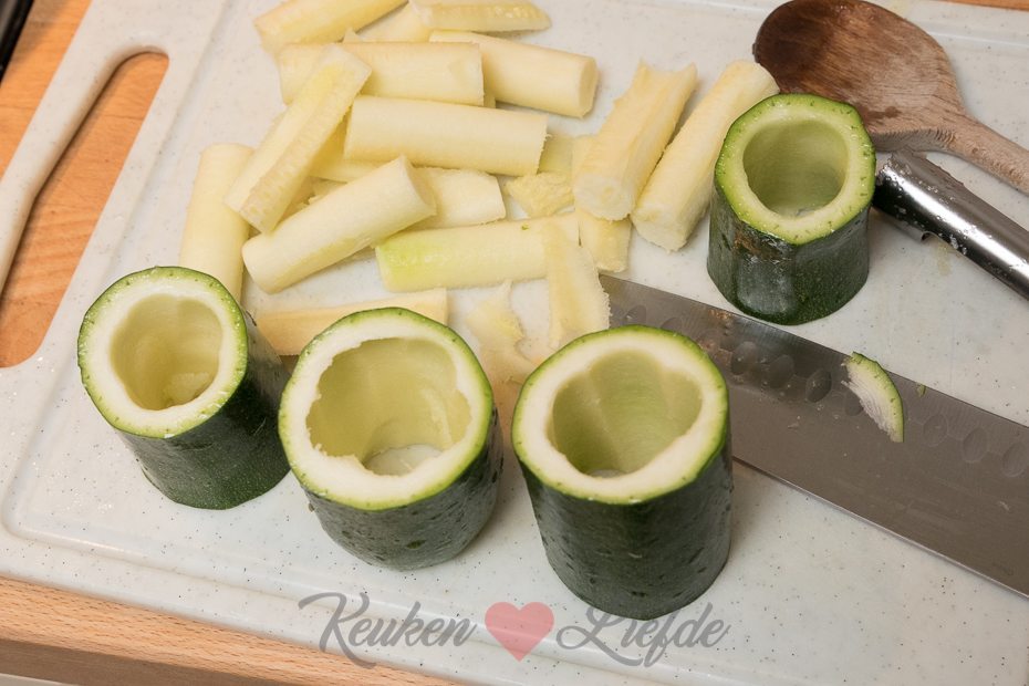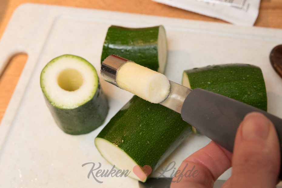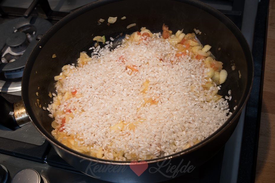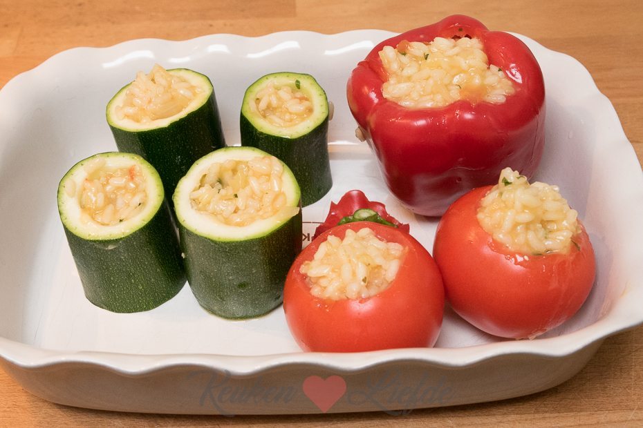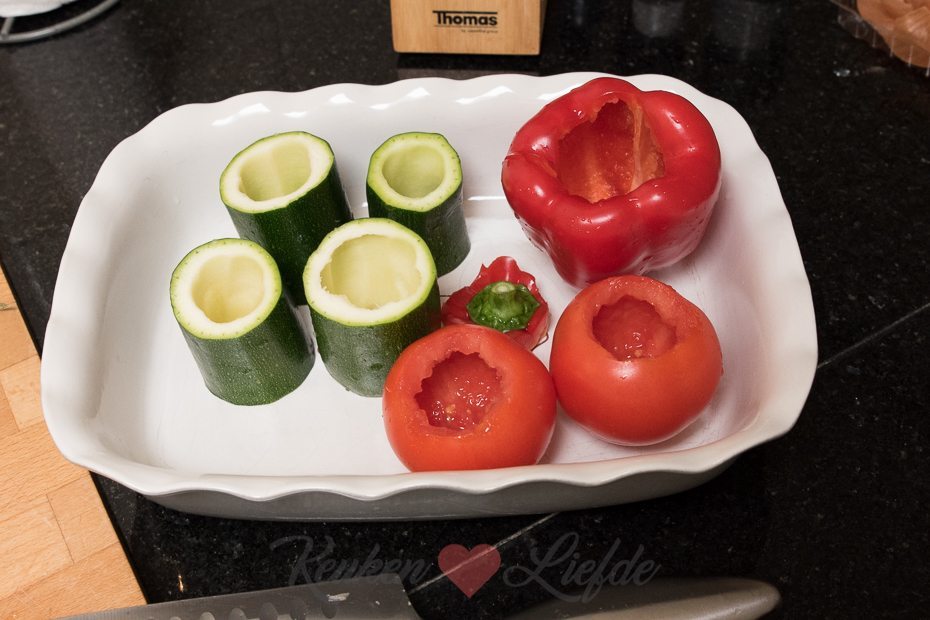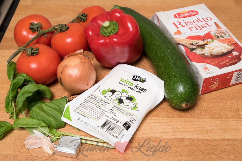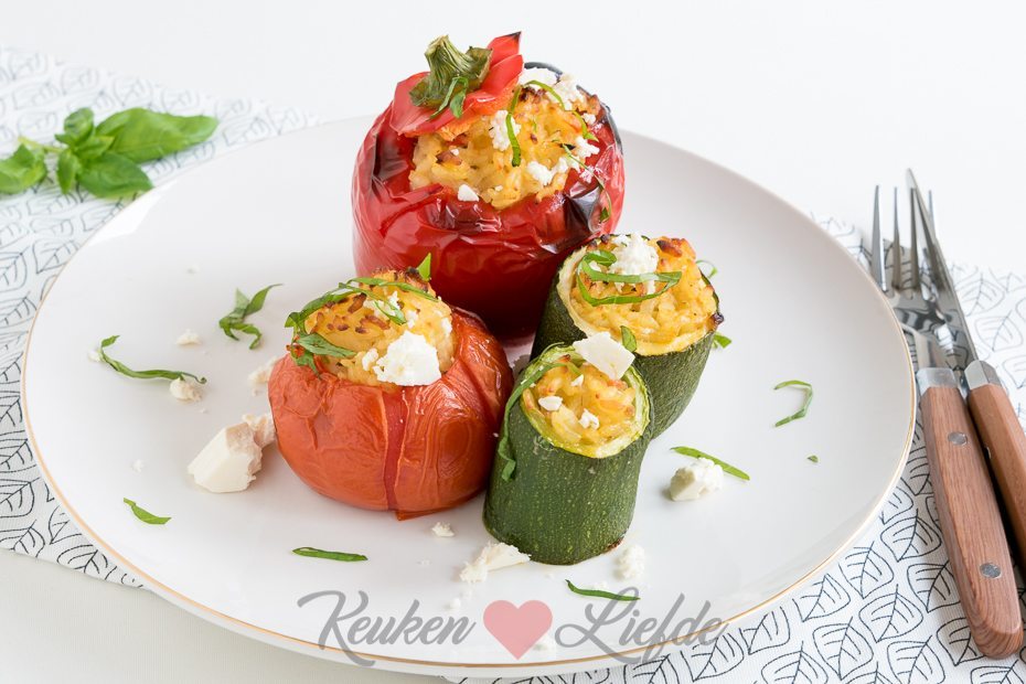 Snijd de harde uiteinden van de courgette en snijd in drie tot 4 evengrote stukken. Hol de courgette uit met een appelboor. Hak de uitgeholde courgette fijn en voeg toe aan de ui en knoflook. Zet de uitgeholde courgettes in een ovenschaal. Snijd een kapje van de bovenkant van de tomaten en lepel met de parisienneboor het vruchtvlees en het sap uit de tomaten. Hak fijn en voeg toe aan de courgette en ui. Voeg de risottorijst toe aan de groenten en verkruimel de bouillontablet erboven. Roer goed door. Voeg 600 ml water toe en doe de deksel op de pan. Kook de risotto in circa 15 tot 20 minuten gaar en je een smeuïge substantie hebt. Roer regelmatig door. Snijd ondertussen het kapje van de paprika’s en verwijder de zaadlijsten. Zet bij de andere groenten in de ovenschaal. Leg de basilicumblaadjes op elkaar en rol ze op. Snijd in smalle repen en roer door de risotto — houd wat achter voor garnering. Vul de uitgeholde groenten met de risotto en zet in de oven. Bak circa 15 minuten, of totdat de groenten zacht zijn.
