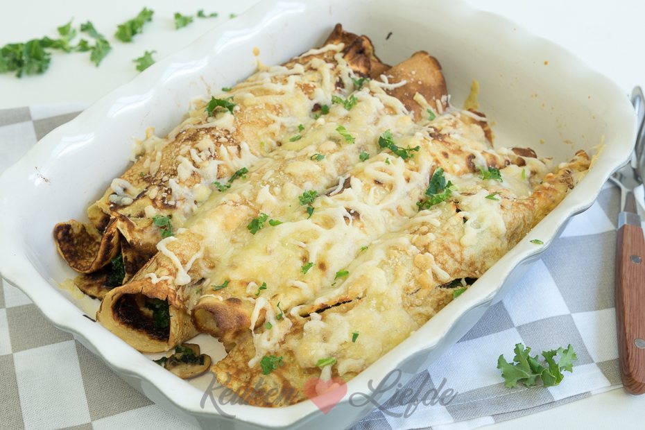 Bak de pannenkoeken circa 15 tot 20 minuten in de oven, of totdat de kaas is gesmolten en de pannenkoeken goed warm zijn.