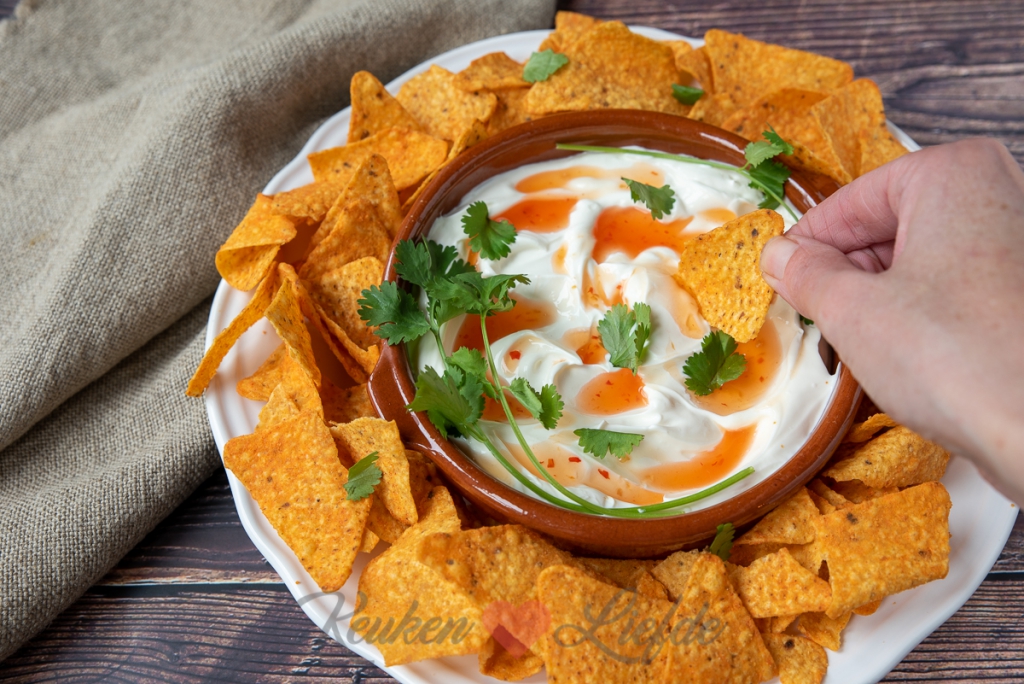 Eindelijk kan ik dit recept afvinken van mijn nog-te-maken-lijst: Gooise dip! Een heerlijke roomkaasdip met zoete chilisaus swirl. Eigenlijk kun je het geen recept noemen, zo simpel is het! Maar dat is nou juist een van de redenen waarom deze dip zo populair is. Makkelijk om te maken — je kan de dip tegenwoordig ook kant-en-klaar in de supermarkt kopen, maar zelf maken is nog sneller! —, en superlekker om chips of bugles in te dippen.