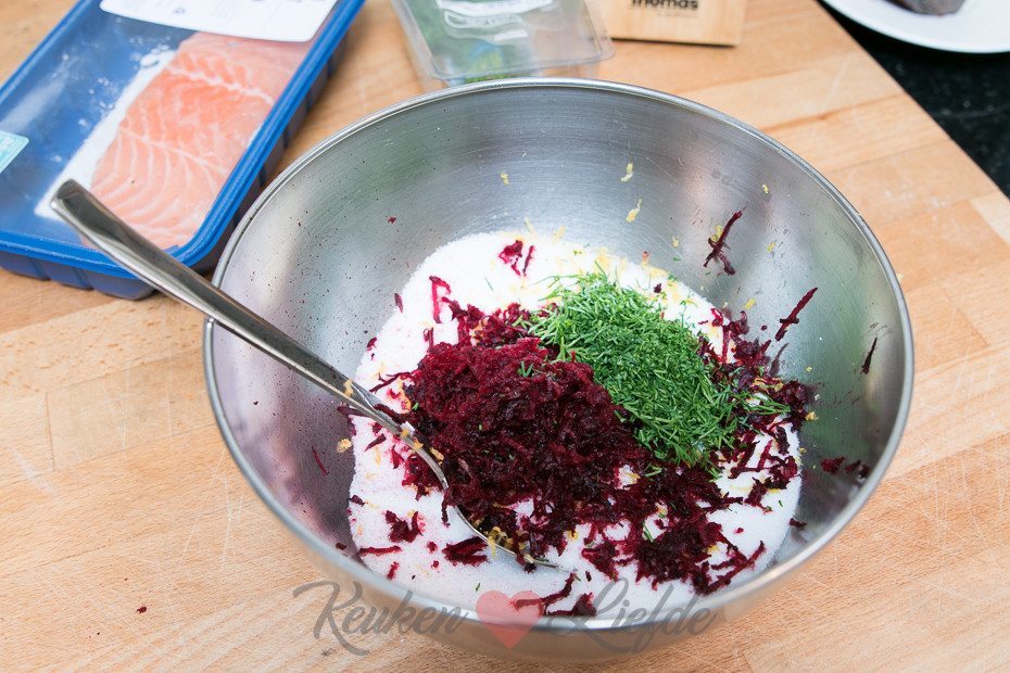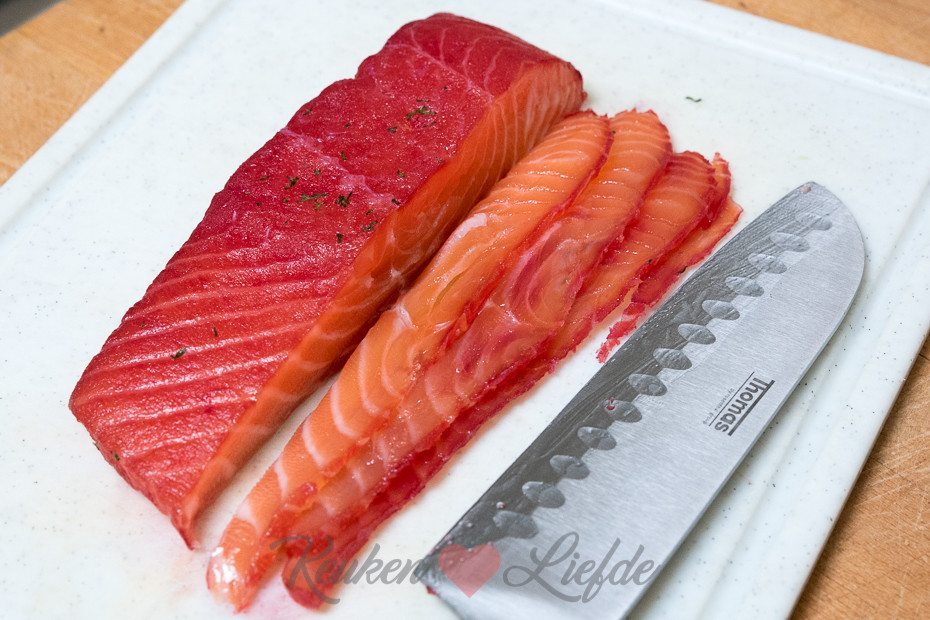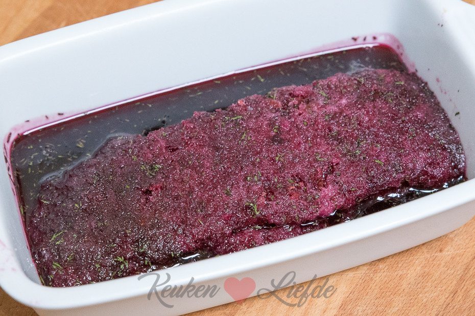 Gravad lax is een Zweedse klassieker en betekent eigenlijk gewoon begraven zalm. Het is een van de makkelijkste voorgerechten die je maar kunt maken, want het enige dat je hoeft te doen is de zalm te pekelen. Dat doe je heel eenvoudig door de zalm te bedekken met een mengsel van zout en suiker en 24 uur weg te zetten in de koelkast. Easy toch! Ik voeg ook nog geraspte biet toe aan de pekel om de zalm aan de buitenkant te voorzien van een prachtig, rood kleurtje. Feestelijkheid op en top! En dat het lekker is, dat spreekt voor zich. Geloof me!