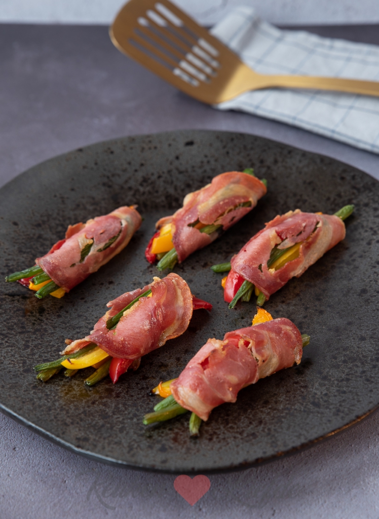 Deze kleurrijke groenterolletjes met haricots verts en paprika zijn een heerlijk bijgerecht om te serveren tijdens een diner. Door de verschillende kleuren paprika krijgt dit gerecht een feestelijk tintje.