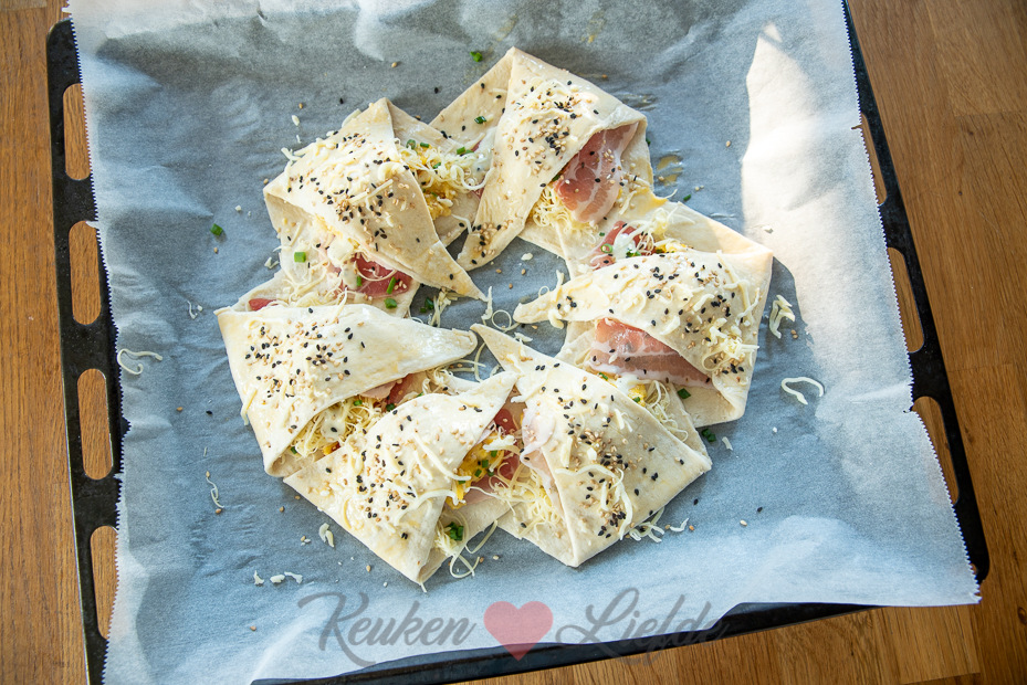 Vouw de punten over het ei naar binnen. Bestrijk de bovenkant lichtjes met ei en bestrooi met sesamzaadjes en de overige kaas.
