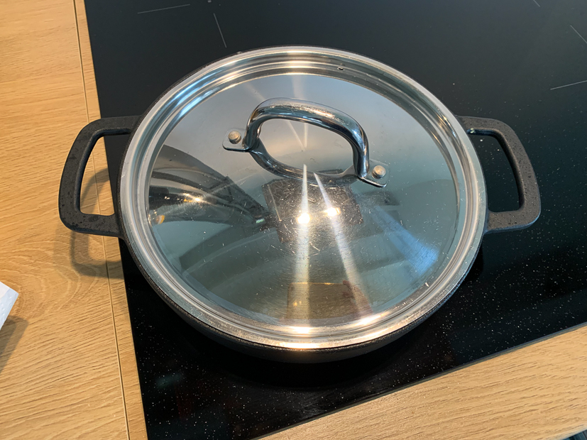 - Koekenpan met dikke bodem en deksel (Het is belangrijk om een pan met dikke bodem te gebruiken omdat anders de onderkant van de pannenkoek verbrandt terwijl de binnenkant en bovenkant nog niet gaar zijn.)