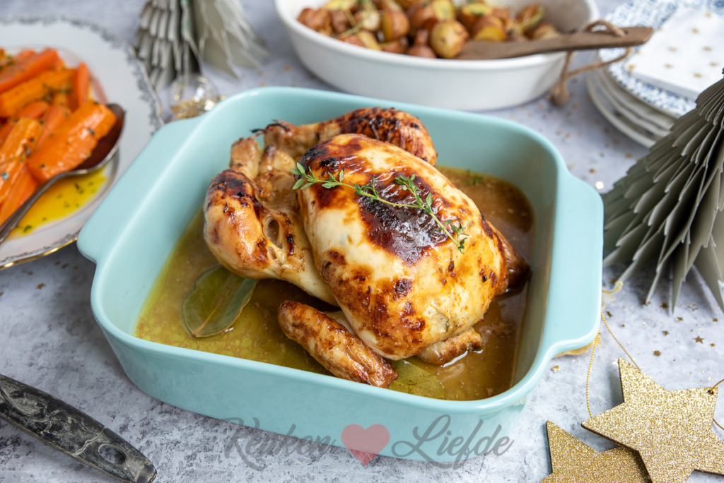 Braad de kip ca. een uur in de oven, tot hij goudbruin is. Haal de kip ieder kwartier uit de oven halen en bedruip met het braadvocht. Draai de kip na een uur om en zet nog een kwartier in de oven, of tot het sap uit de kip helder en de kip goudbruin is.
