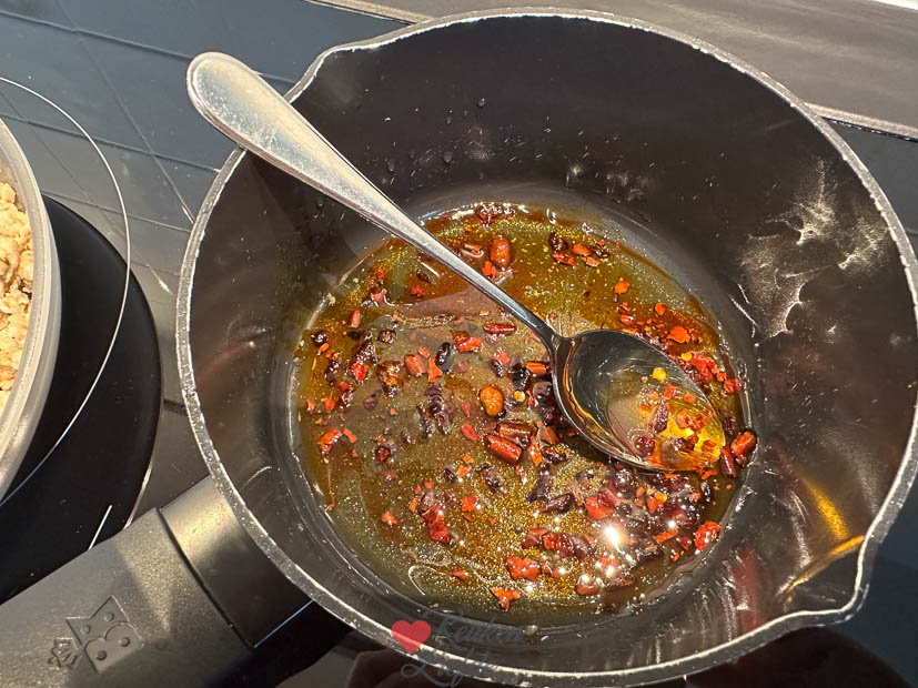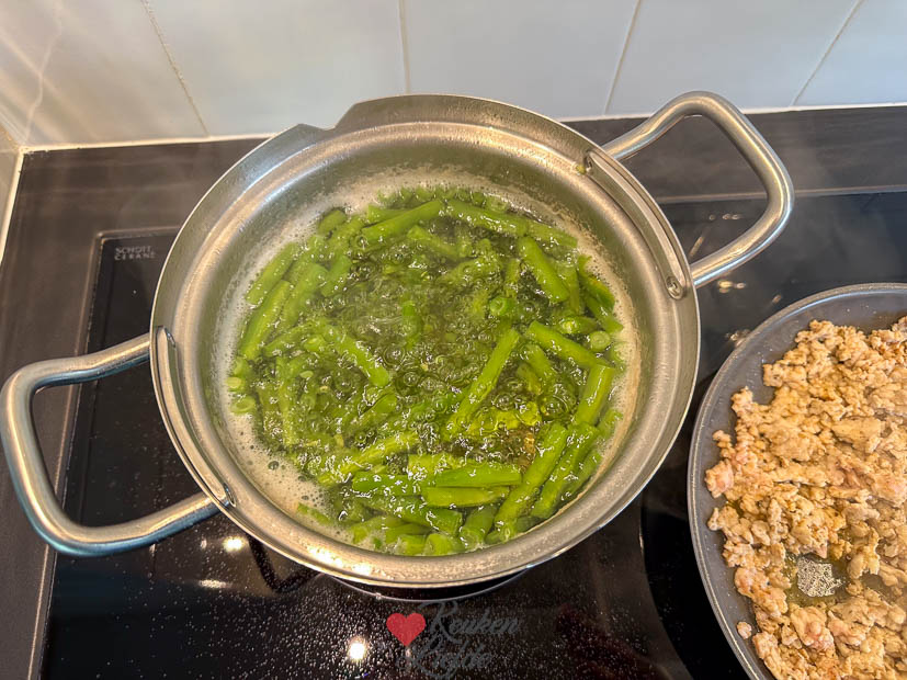 Meestal wordt er avocado en rundergehakt gebruikt in de hot honey bowl, maar ik heb sperziebonen en kipgehakt gebruikt. Samen met de geroosterde zoete aardappel is dat een heerlijke match.