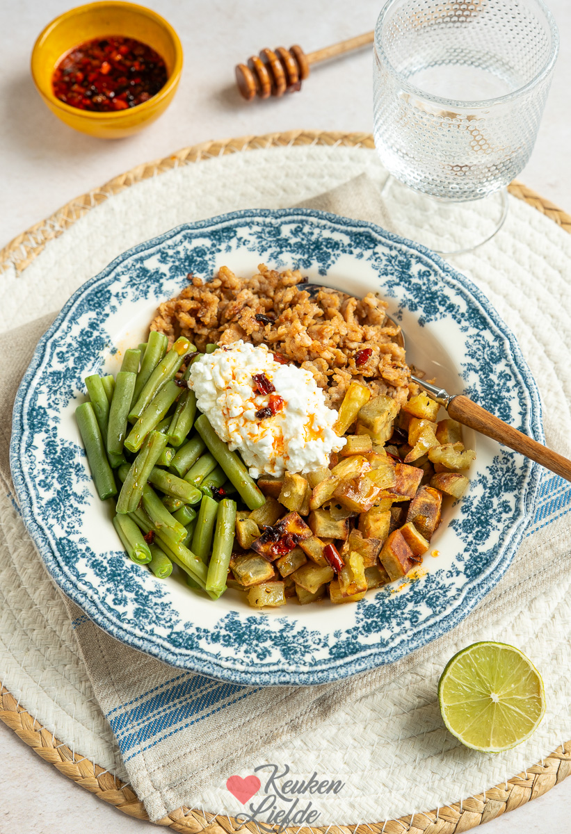 De hot honey bowl heb je vast voorbij zien komen op social media. Het gerecht is relatief laag in vet en rijk aan eiwit. Ik maakte een eigen variant met geroosterde zoete aardappel, kipgehakt en sperziebonen. Natuurlijk mogen de Hüttenkäse en een goede drizzle hot honey – hete honing -, niet ontbreken.