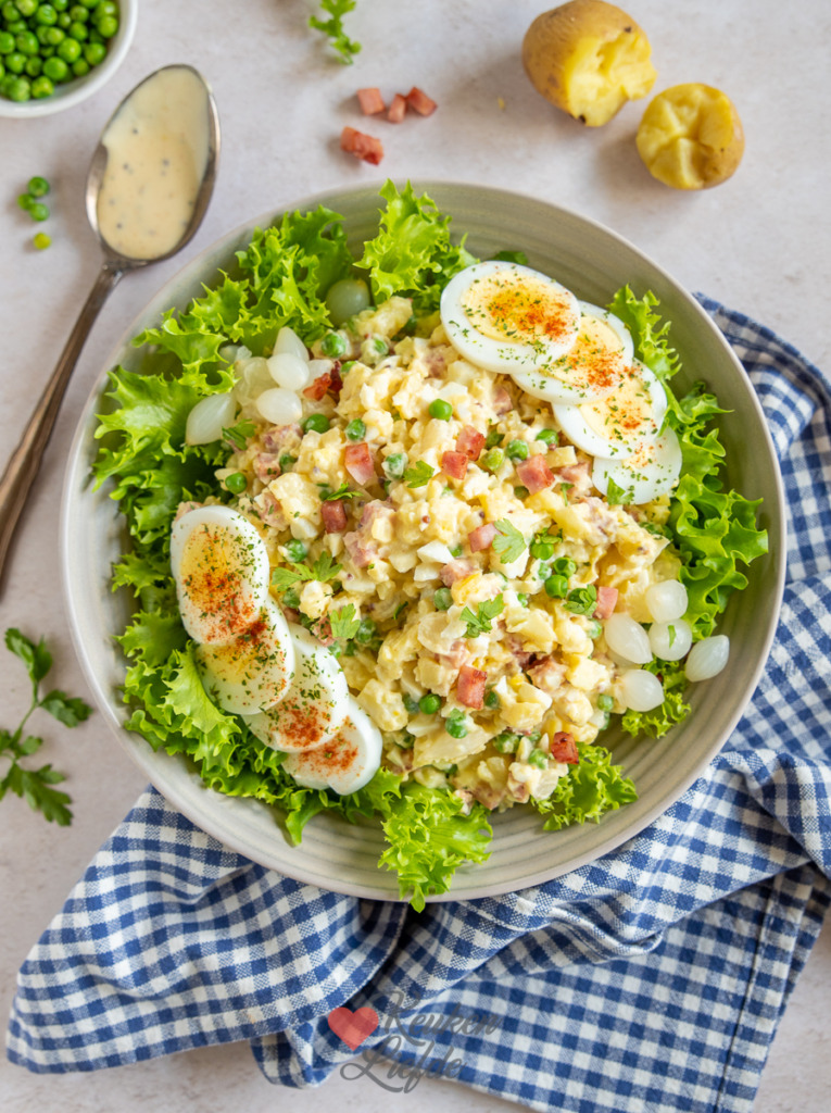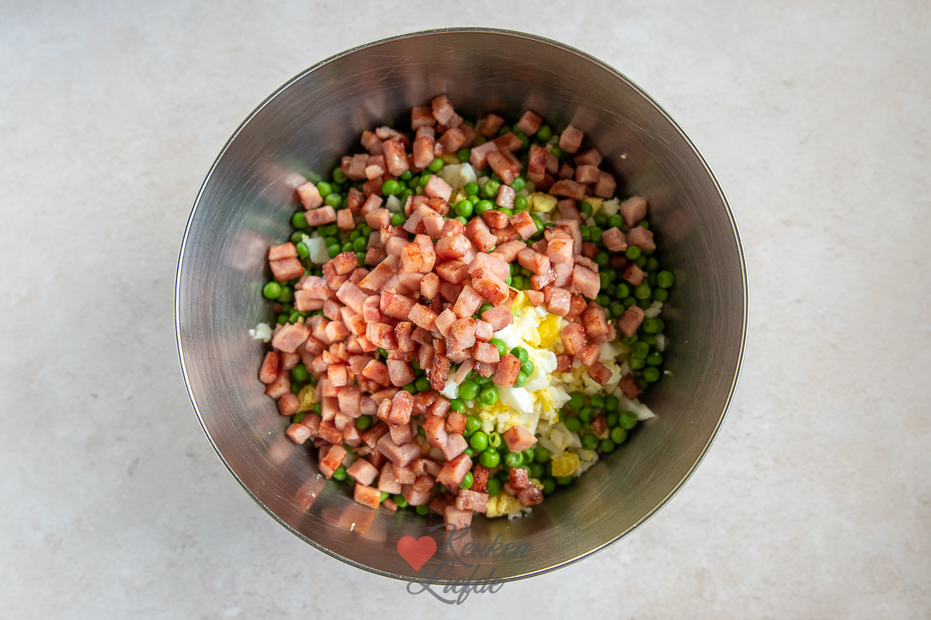 De lekkerste huzarensalade koop je niet kant-en-klaar in de winkel maar maak je lekker zelf. Hij mag niet ontbreken bij de barbecue, maar smaakt eigenlijk overal lekker bij. Deze huzarensalade met ham en ei is makkelijk om te maken en verrukkelijk. Naast ham en ei zitten er ook doperwtjes en zoetzure zilveruitjes in voor een frisse smaak en knapperige bite.