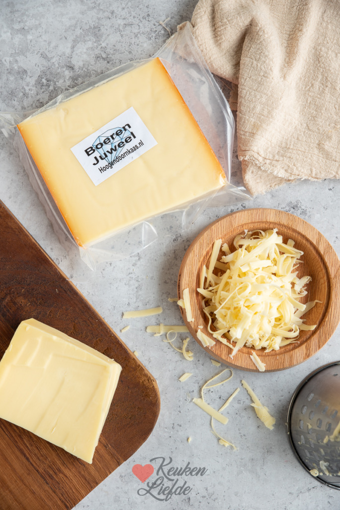 Hoogendoorn Kaas heeft de grootste voorraad Boeren Juweel gerijpt en in de verkoop, maar grijp je onverhoopt toch mis dan kun je hem vervangen door een andere romige, belegen (boeren)kaas naar keuze. Ze hebben een groot online assortiment kazen en delicatessen waar je uit kunt kiezen, of vraag naar een lekker alternatief in hun marktkraam (kijk op hun website voor voor de marktlocaties), dan kun je meteen een stukje proeven. Gebruik liever geen kant-en-klaar geraspte kaas uit een zakje, die smelt en smaakt minder goed en dat proef je terug.