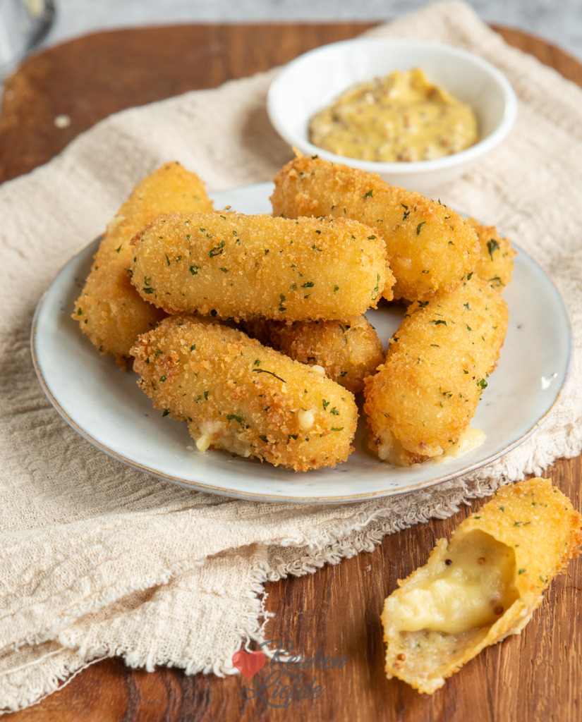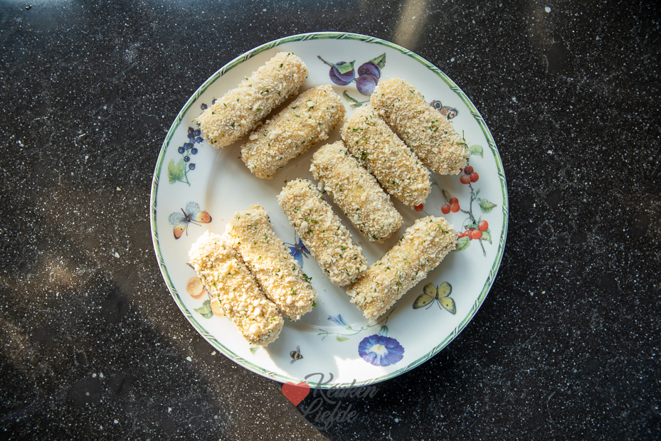 Deze kaaskroketjes met romige kaasragoutvulling zijn een van mijn guilty pleasures. Heerlijk als borrelhapje met een mosterd-, of zoete chilisausdip, maar ook lekker als voorgerecht geserveerd met wat zachte slasoorten lichtjes aangemaakt met honing-mosterddressing.