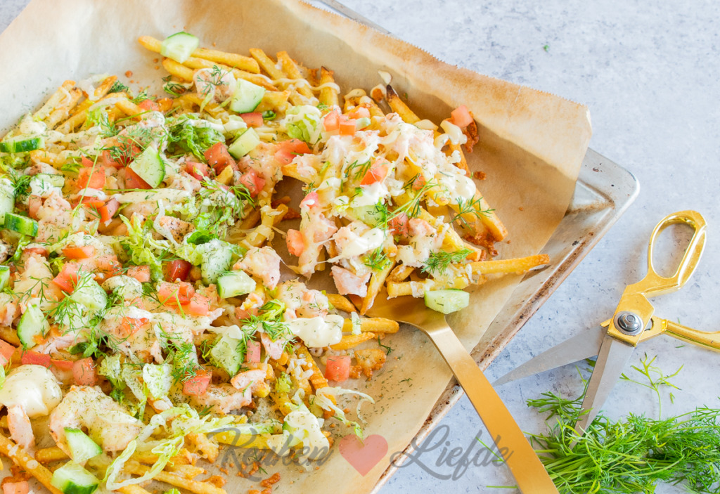 Een makkelijk gerecht uit de oven, ik hou ervan! Deze kapsalon met zalm van het bakblik zet je in 20 minuten op tafel. Het is een echte familiefavoriet, iedereen is er dol op. Maak het af met verse salade en knoflooksaus!