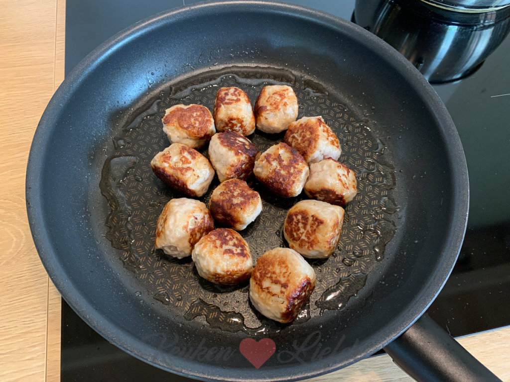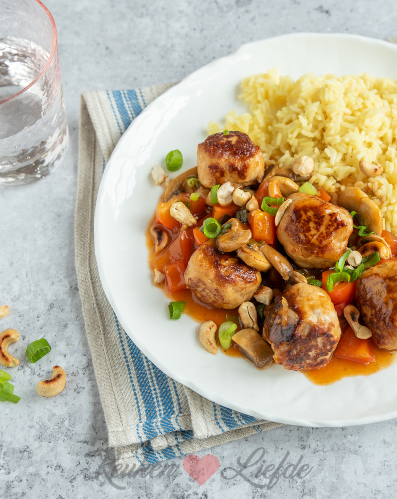 Heerlijke kipgehaktballetjes in zoetzure saus met paprika en champignons. Lekker om te serveren met gekookte rijst, maar ook een goed idee met gekookte pasta of gebakken aardappeltjes. Tip voor een doordeweekse dag; als je de kipgehaktballetjes al een dag van tevoren maakt, staat dit gerecht op de dag zelf snel op tafel!