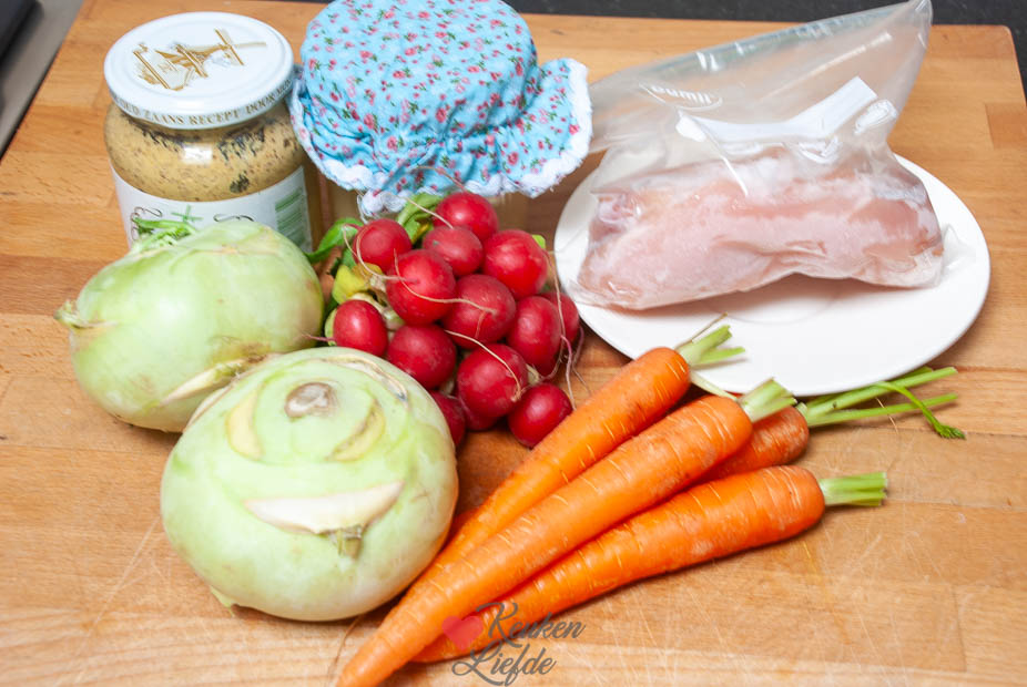 Koolrabistamppot met honing-mosterdkip – Eigenlijk was ik van plan om een salade te maken met de twee prachtige koolrabi exemplaren die ik kocht, maar toen ik afgelopen dinsdag een stamppotpakket kreeg thuisgestuurd, besloot ik de boel om te gooien. Stamppot was alweer even geleden en één blik op het prachtige boerenbontservies was genoeg om me over de streep te trekken.