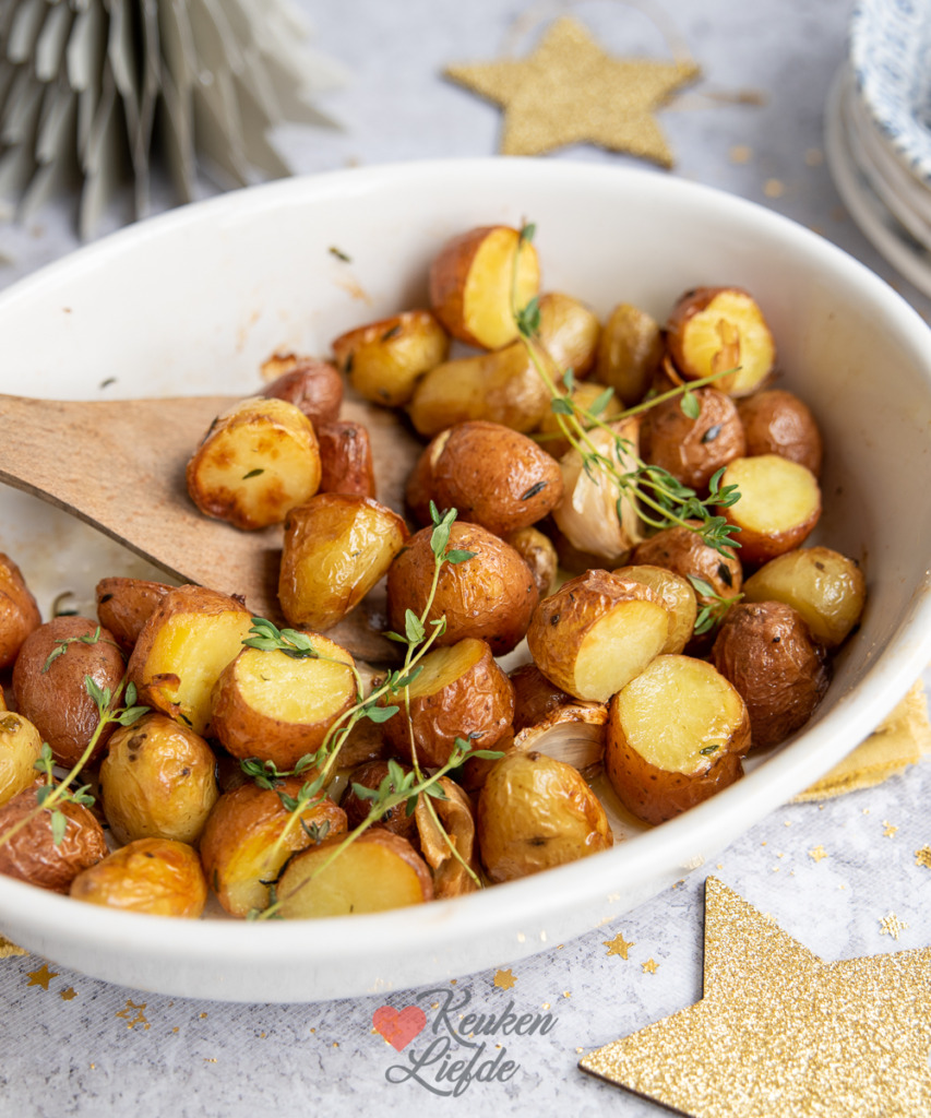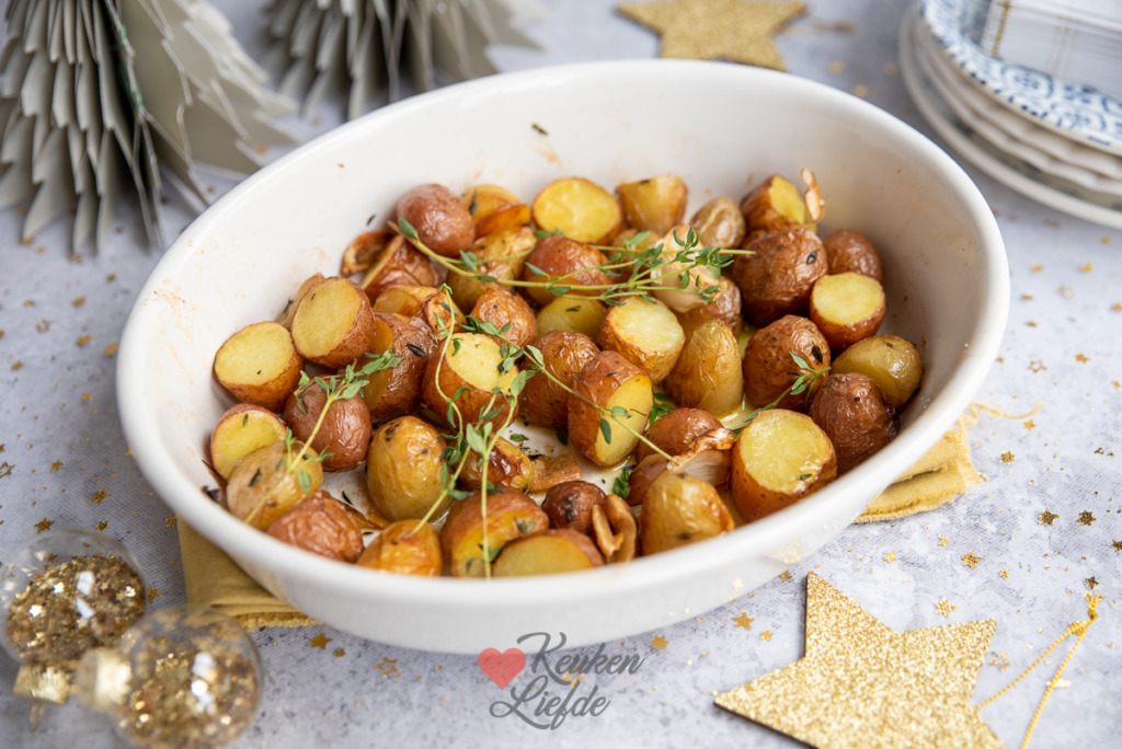 Zo’n simpel en lekker bijgerecht om tijdens het kerstdiner te serveren: deze krieltjes uit de oven met subtiele smaak van tijm en knoflook. Door de knoflooktenen in de schil mee te roosteren in de oven worden ze heerlijk zacht en zoet van smaak. Naderhand knijp je ze zo uit hun vel.