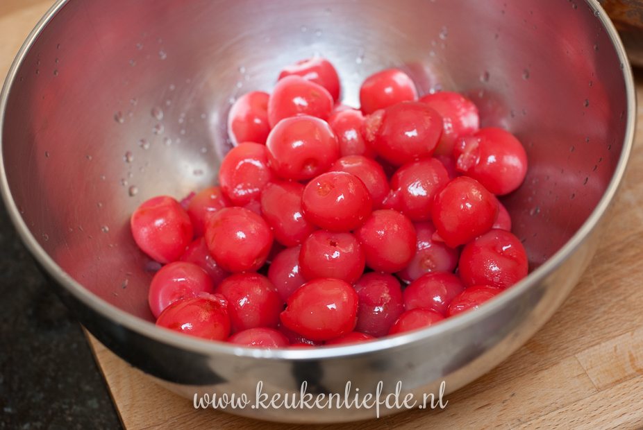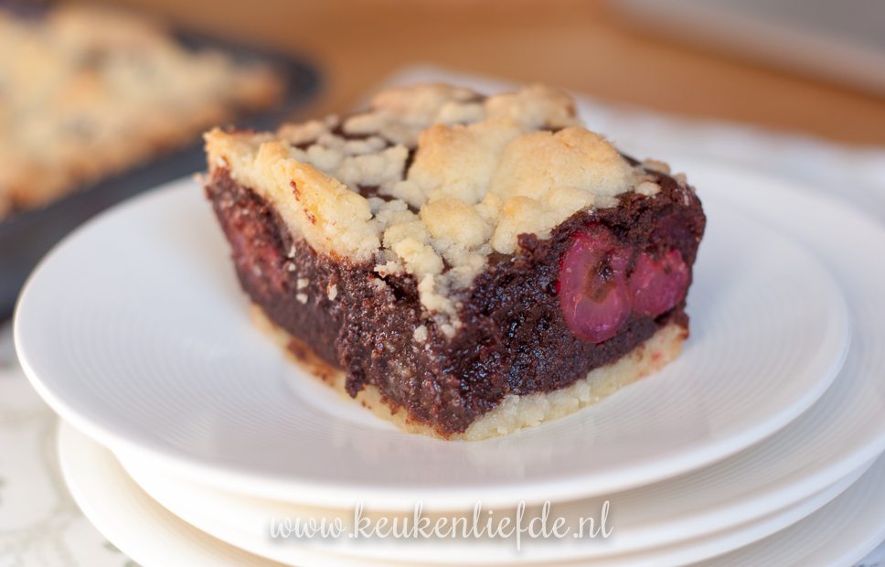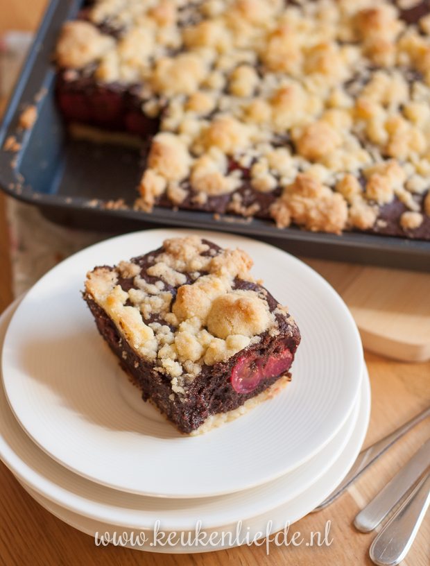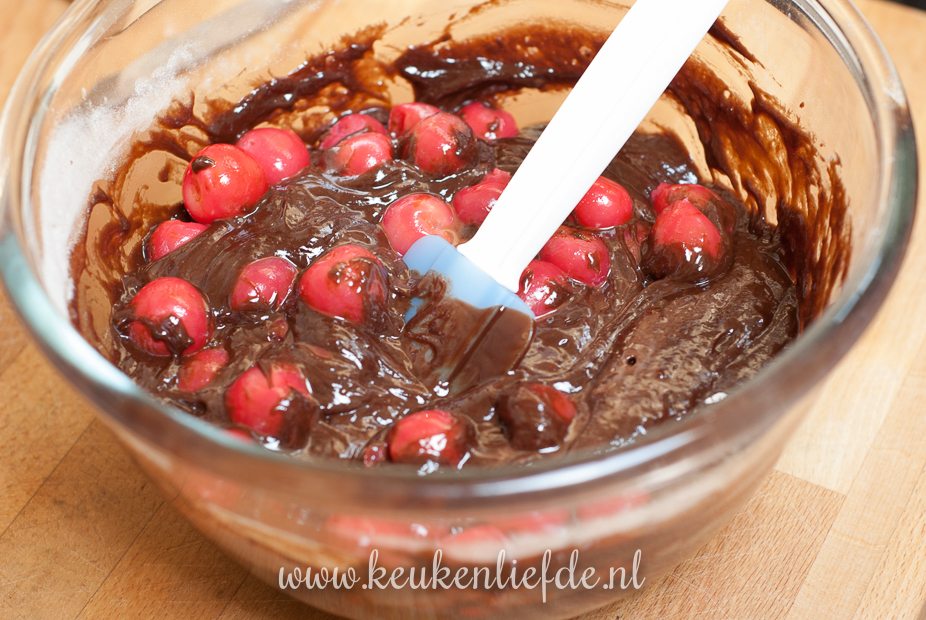 Roer de uitgelekte kersen (goed laten uitlekken, anders gaat het beslag schiften) door het beslag. Verdeel het beslag over de deegbodem. Bedek met de overige deegkruimels.
