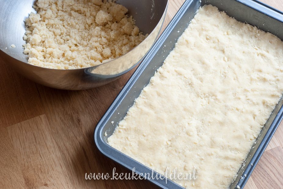 Doe 300 gram bloem, 145 gram suiker, 175 gram koude boter (in blokjes gesneden) en zout in een kom en kneed met je handen totdat er een kruimeldeeg ontstaat. Verdeel de helft van het kruimeldeeg over het bakblik en druk goed aan.