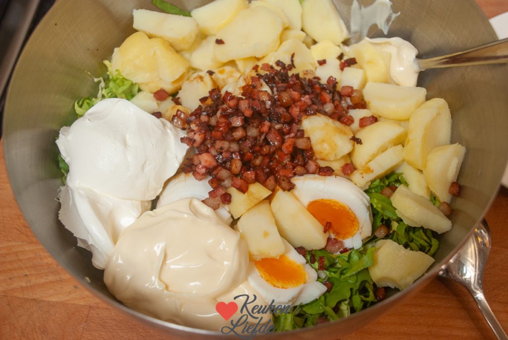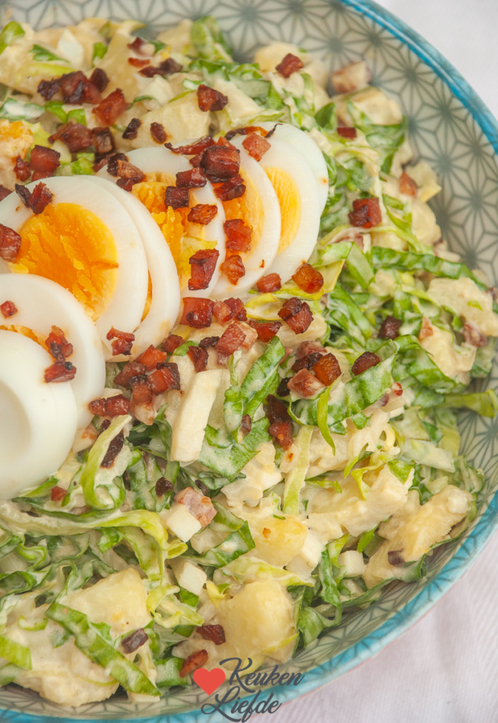 De variant van mijn oma en moeder is een salade die je als bijgerecht op tafel zet, maar omdat ik hem zo lekker vind wilde ik er graag een maaltijdsalade van maken. In dit recept voeg ik daarom iets meer aardappel toe en ook een hardgekookt eitje. De uitgebakken spekjes geven de andijviesalade een lekkere, zoutige bite en maken het smulfeest compleet!