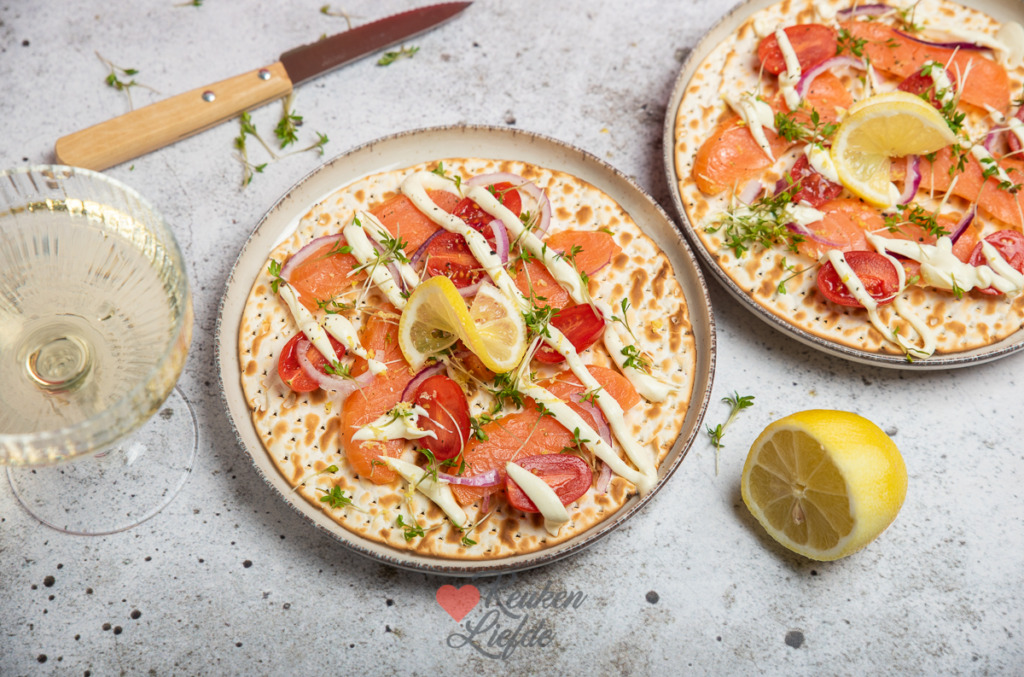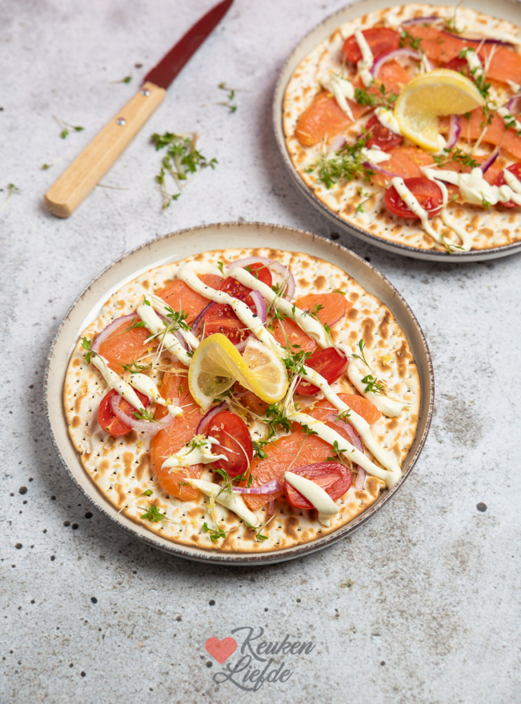 Deze heerlijke matzepizza met zalm komt uit het nieuwste kookboek van tv-kok Rudolph van Veen: Rudolph’s Kitchen – Het Hele Jaar Feest. In dit prachtige, dikke boek vind je 100 recepten voor alle feestdagen, van zoet tot hartig. Ik ben al jaren fan van Rudolph. Hij weet altijd weer te verrassen en ook dit boek is weer een feest. Zowel om doorheen te bladeren als om uit te koken. Er staan zoveel leuke en originele recepten in!