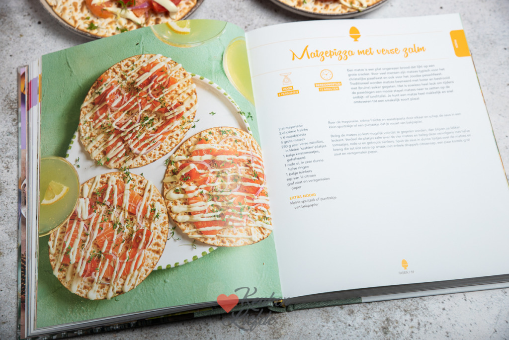 De hoofdstukken in het boek zijn verdeeld in alle feestdagen die voorbij komen in een jaar. Niet alleen de officiële feestdagen zoals Kerst, Oud & Nieuw en Pasen, maar ook Joodse Feestdagen, Midzomernacht, Ketikoti, Dierendag, Oktoberfest, Halloween, Suikerfeest, Carnaval, Vader- en Moederdag, Sinterklaas, Chinees Nieuwjaar, Valentijnsdag en Verjaardag. De heerlijke foto’s spatten uit het boek. De recepten zijn voorzien van een leuke intro en variëren van snel tot uitgebreid, maar zijn over het algemeen makkelijk om te maken. Deze matzepizza met zalm komt uit het hoofdstuk Pasen. Ze zijn klaar in 15 minuten en heerlijk!