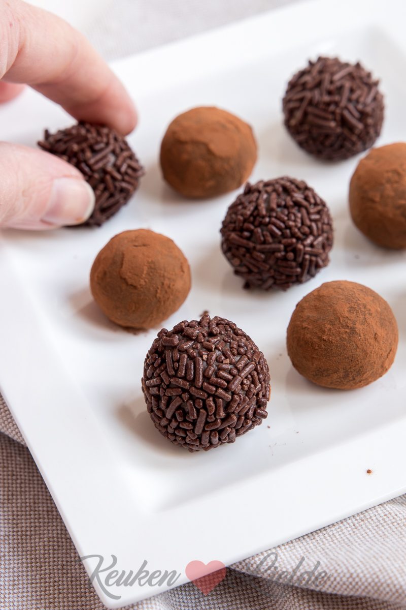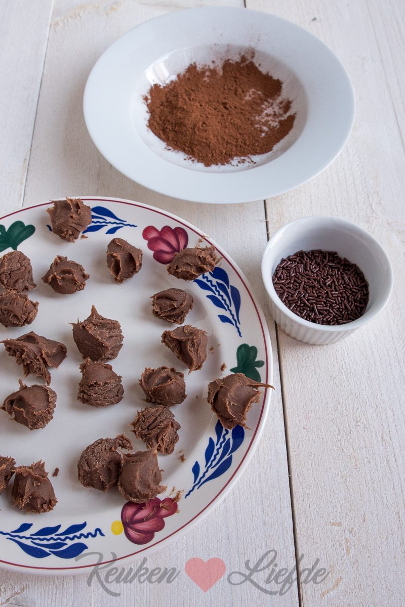 Schep met een theelepel een beetje ganache uit de kom en rol in je handen tot een balletje. Rol nu door de cacao of een ander ingrediënt naar keuze. Leg de melkchocoladetruffels op een bord en laat afgedekt in de koelkast nog een uur opstijven.