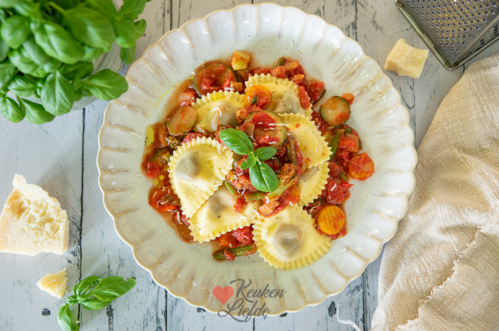 Mezzelune met groente en tomatensaus. Dit Italiaanse pastagerecht staat in 15 minuten op tafel en is heerlijk. Mezzelune is gevulde pasta die je vindt in de koeling in de supermarkt. Zelf maken kan natuurlijk ook (deze zelfgemaakte pompoenravioli is een aanrader) maar dat is iets meer werk.