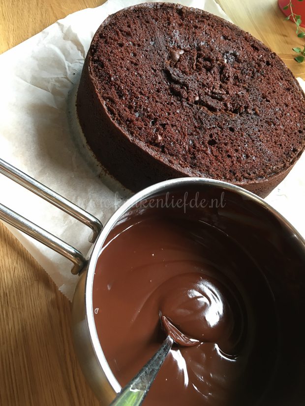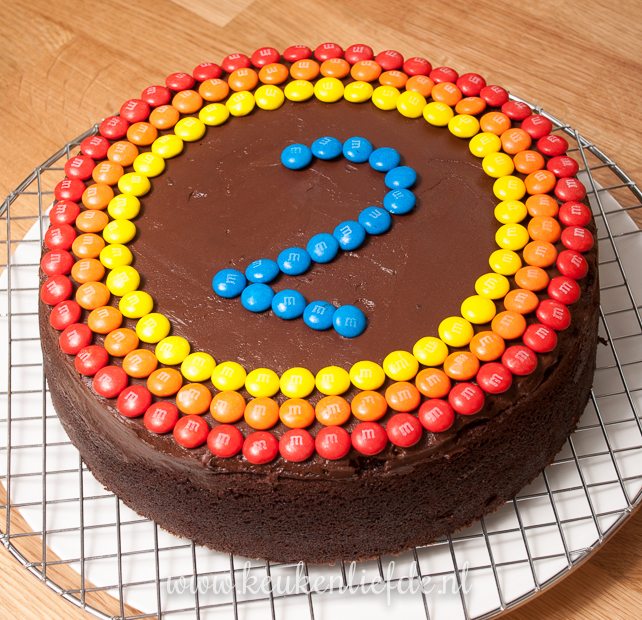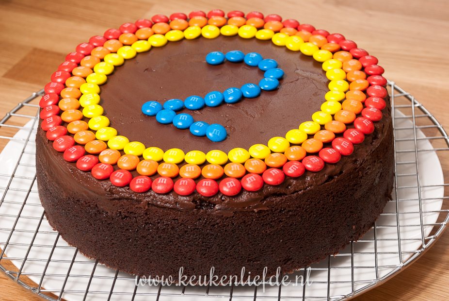 Maak de chocoladetaart volgens dit recept. Snijd na het bakken een stukje van de bovenkant van de taart af zodat hij recht is. Bestrijk de bovenkant van de taart royaal met chocoladeganache (let erop dat de chocoladeganache dik genoeg is om mee af te smeren) en versier met de M&M’s.