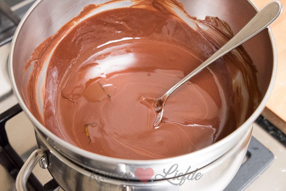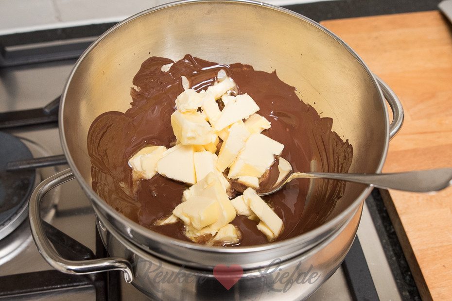 Breek de chocolade in stukjes en smelt au bain-marie. Voeg de honing en boter toe en roer totdat de boter gesmolten is.