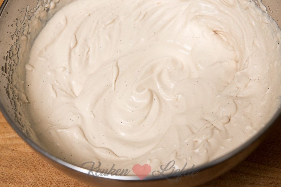 Snijd de vanillepeul open en schraap met een mes de vanillemerg eruit. Klop de slagroom samen met de vanillemerg en de 2 el bruine suiker stijf. Spatel de bourbon erdoor.