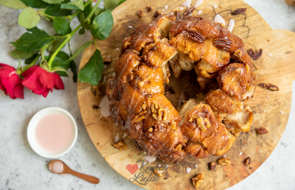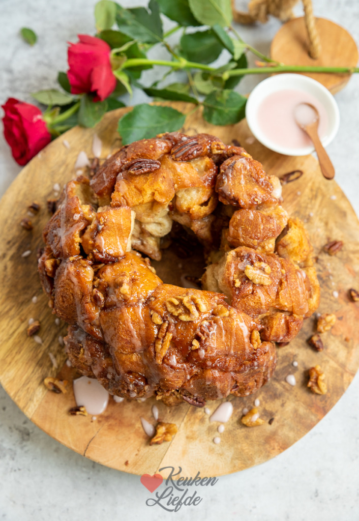 Dit monkey bread (apenbrood) stond al lang op mijn lijstje om te maken, maar om een of andere reden kwam het er steeds niet van. Eindelijk kan ik hem afvinken! Je maakt dit zoete plukbrood door kleine stukjes deeg te rollen door kaneelsuiker (voor een lekkere crunch voeg ik ook noten toe) en deze in een tulbandvorm in de oven af te bakken. De buitenkant van het brood gaat door de boter en kaneelsuiker een beetje karameliseren en wordt lekker knapperig en goudbruin, de binnenkant is zacht en smakelijk. Ik maak een makkelijke variant met kant-en-klaar croissantdeeg. Makkelijk, maar zeker niet minder lekker. Na het bakken drizzle ik nog wat suikerglazuur over het brood. Het resultaat is onweerstaanbaar!