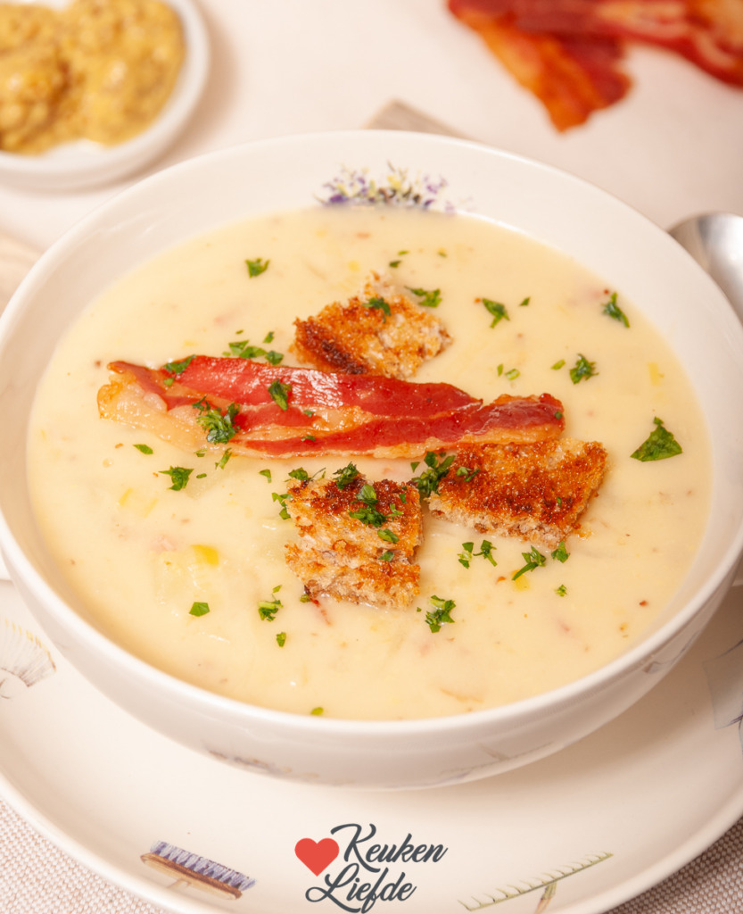 De groentesoep met gehaktballetjes van mijn moeder is altijd mijn favoriet geweest, maar sinds ik deze mosterdsoep maakte heb ik er een favoriet bij! Deze mosterdsoep is heerlijk romig en vol van smaak en heeft een aangenaam pitje. Ik serveer hem met krokante broodcroutons en uitgebakken spek. Verslavend lekker!