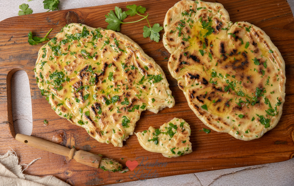 Met dit recept maak je twee flinke naanbroden, of vier kleinere stuks naan. Het luchtig gebakken naanbrood wordt na het bakken royaal bestreken met knoflookboter wat het platbrood lekker smeuïg maakt.