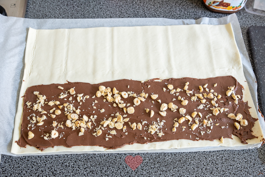 Rol het bladerdeeg uit op een aanrechtblad, laat liggen op het bijbehorende bakpapier. Bestrijk de onderste helft van het bladerdeeg met een laag Nutella en bestrooi met hazelnoten (houd wat hazelnoten achter om over de bovenkant te strooien).