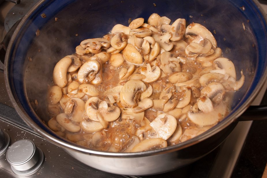 Ik strooi wat bloem over de champignons en gebruik Creme Fraiche ipv slagroom.