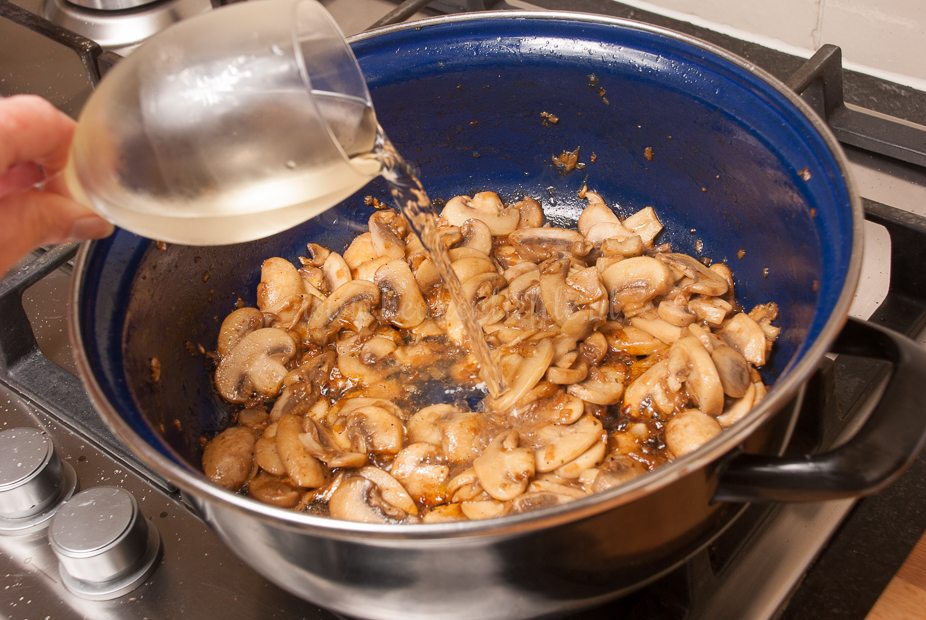 Ik kook graag met witte wijn, het geeft net een extra smaakdimensie aan de saus. Maar je kunt het ook gewoon weglaten. Als je nooit wijn drinkt en het dus ook niet in huis hebt is het zonde om er een fles voor te kopen.