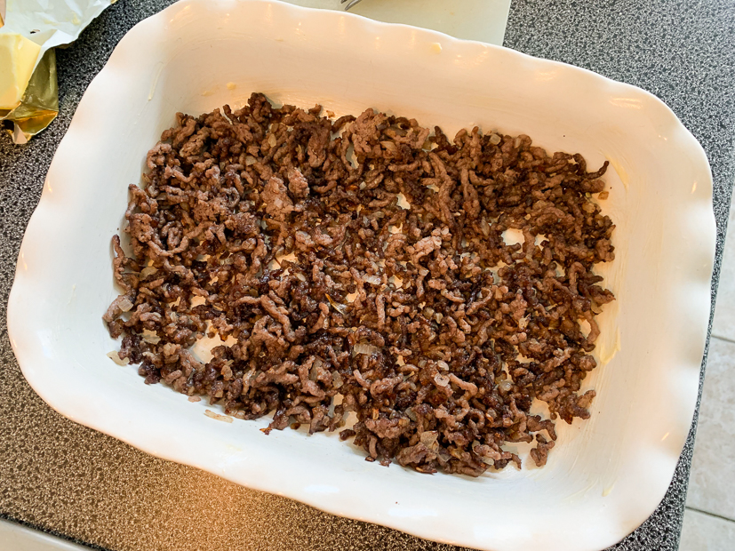 Verhit de koekenpan met een scheutje olijfolie en bak de sjalotten tot ze zacht en glazig zijn. Voeg het gehakt toe en breng goed op smaak met zout en peper uit de molen. Bak het gehakt rul op hoog vuur tot het bruin begint te kleuren. Gooi het gehakt in een zeef om het overtollig vet kwijt te raken. Verdeel het gehakt over de bodem van de ovenschaal en bedek met de rodekool.