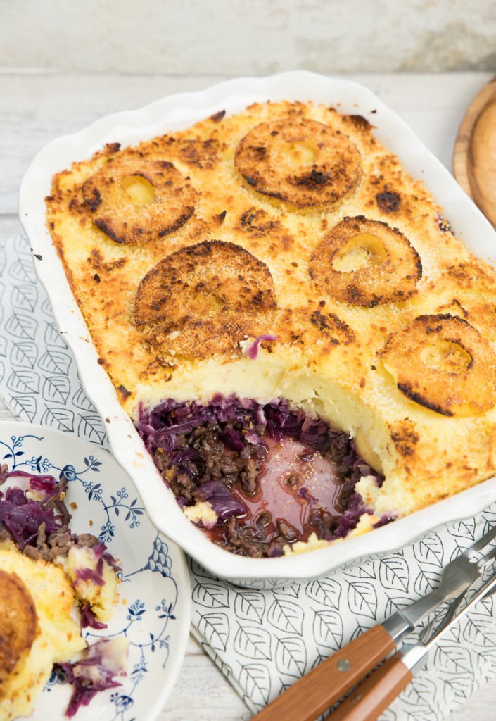 Verdeel de aardappelpuree over de rodekool en appel en strijk glad. Verdeel de rest van de gebakken appels over de puree. Bestrooi de bovenkant met panko en de overige (kleine vlokjes) roomboter.