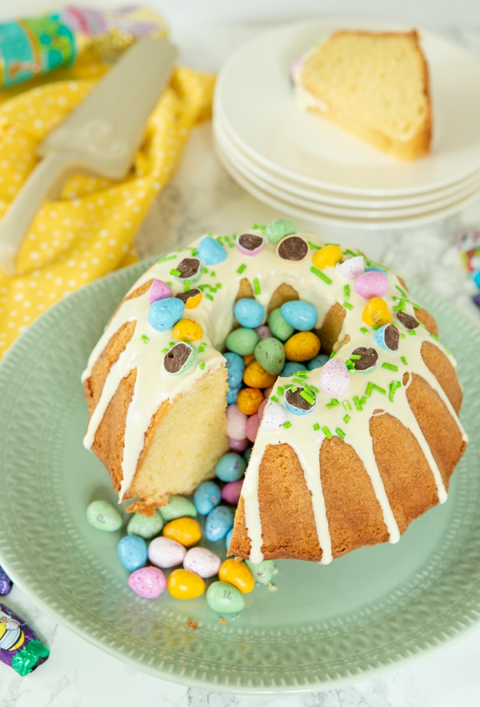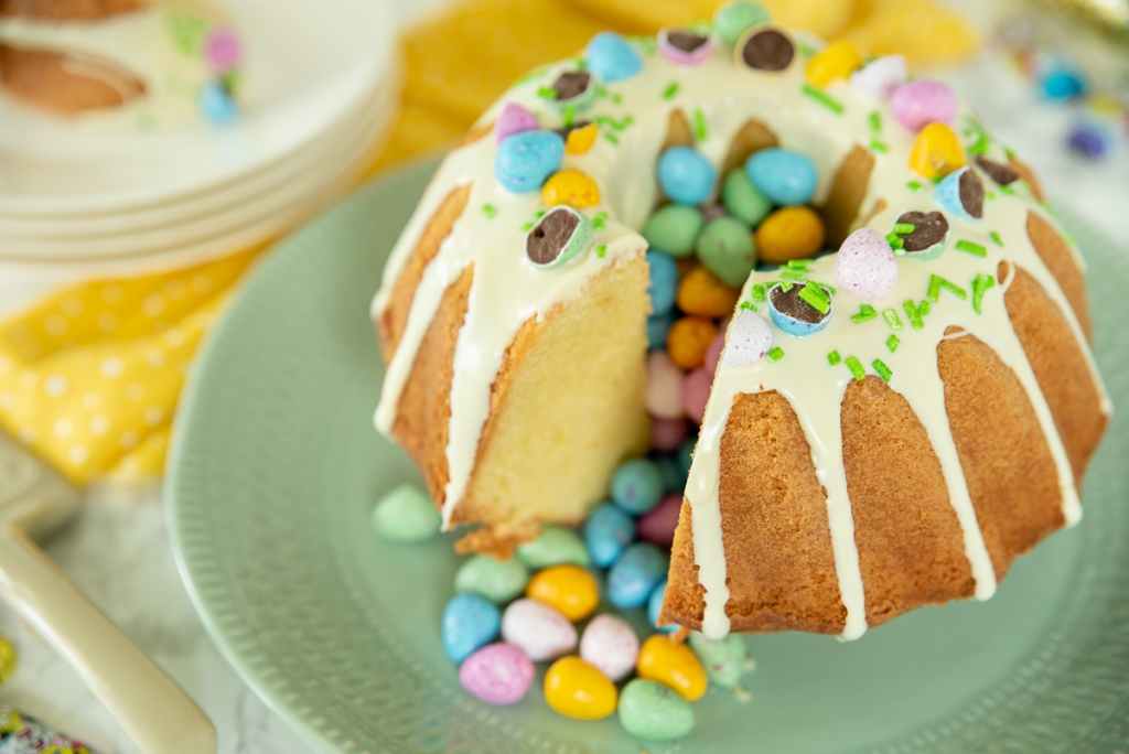 Smelt de witte chocolade en kokosolie au bain-marie in een kom, zorg ervoor dat de kom met de chocolade het water niet aanraakt en smelt de chocolade langzaam boven niet te heet water, anders kan de chocolade gaan schiften. Laat de chocolade iets afkoelen en schenk dan over de tulband. De kokosolie zorgt ervoor dat de witte chocolade na het opstijven wat zachter blijft. Garneer met de paaseitjes en suikerstrooisel. Laat afkoelen tot de chocolade gestold is.