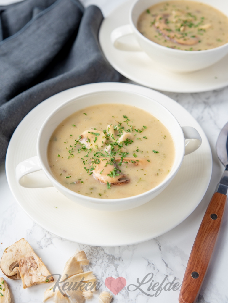 Voeg de bouillon toe en breng al roerend aan de kook. Zet het vuur wat lager en kook zachtjes verder tot de soep mooi gebonden en glad is. Voeg de paddestoelen mix, champignons en room toe en kook nog 10 minuten zachtjes mee, tot de paddestoelen en champignons zacht zijn.
