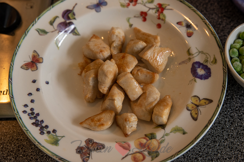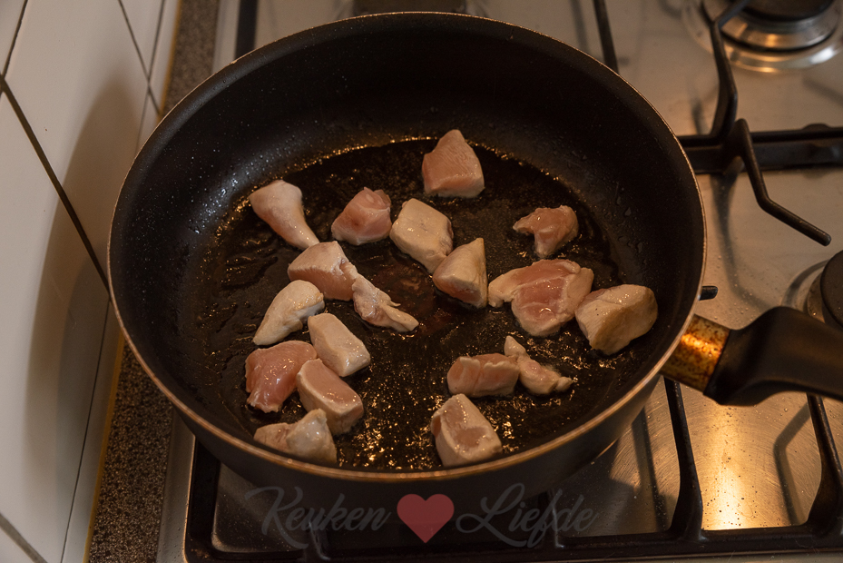 Verhit een hapjespan met een scheutje zonnebloemolie en bak de kip op hoog vuur rondom goudbruin. Breng op smaak met zout en peper. Schep uit de pan en zet opzij.