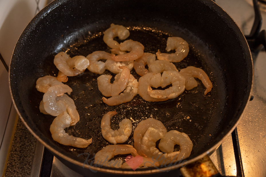 Voeg indien nodig een extra scheutje zonnebloemolie toe aan het bakvet in de pan en bak de garnalen op hoog vuur, tot ze roze zijn. Bestrooi met een beetje zout. Schep uit de pan bij de kip.