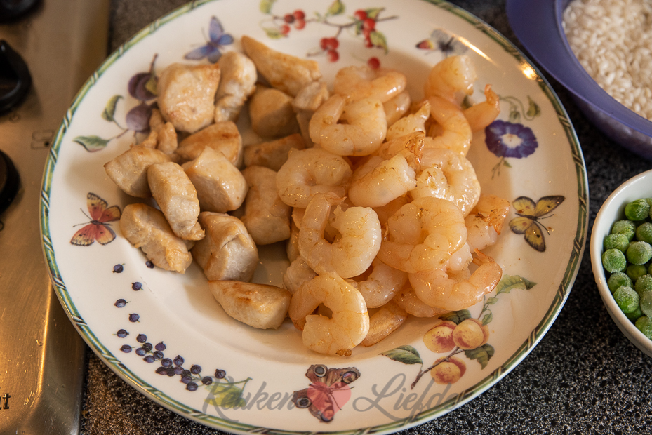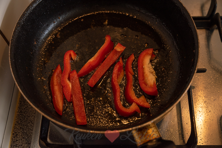 Bak in het bakvet van de kip en garnalen de reepjes paprika op hoog vuur, tot ze zacht zijn en beginnen te kleuren. Schep uit de pan bij de kip en garnalen. Dek af met alufolie en houd warm.
