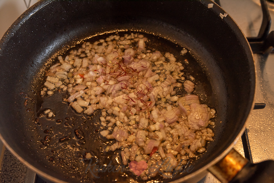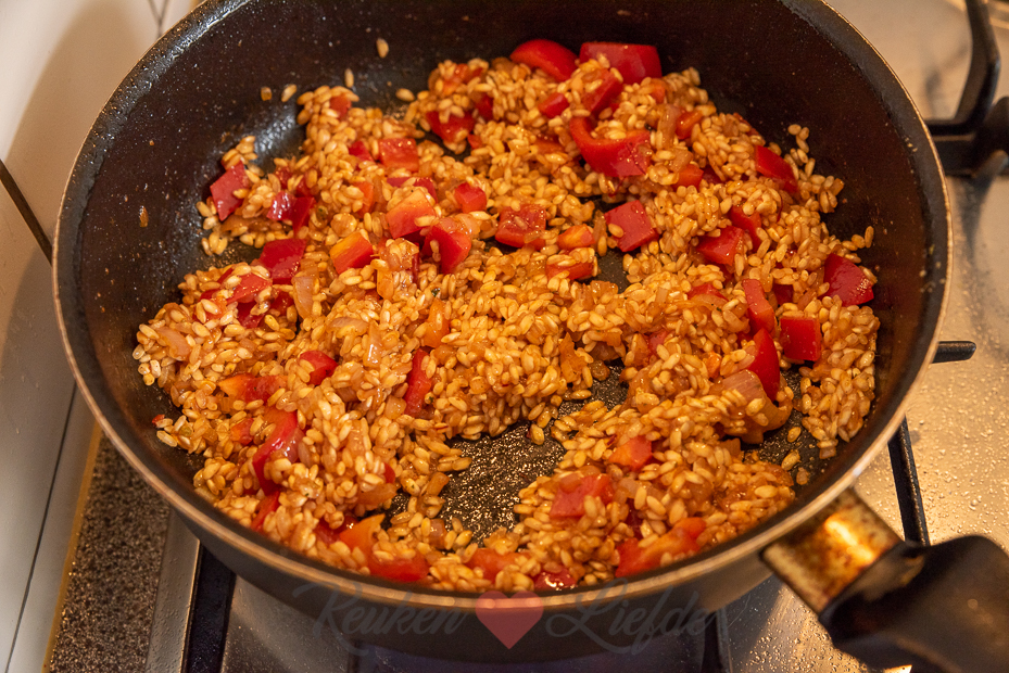 Voeg indien nodig weer wat extra olie toe aan het bakvet in de pan en fruit de sjalot 1 minuut op middelhoog vuur. Voeg de knoflook en paprikablokjes toe en bak kort mee. Voeg de saffraan, tomaten frito en risottorijst toe en bak al roerend een 1/2 minuut mee. Voeg de bouillon toe en breng het vocht aan de kook. Zet het vuur lager en laat de risotto circa 20 tot 25 minuten zachtjes pruttelen tot de risotto beetgaar is en de bouillon bijna helemaal is opgenomen. (Als de risotto nog te hard is kun je nog een extra scheutje water toevoegen.) Voeg halverwege de kooktijd de doperwtjes toe aan de risotto.