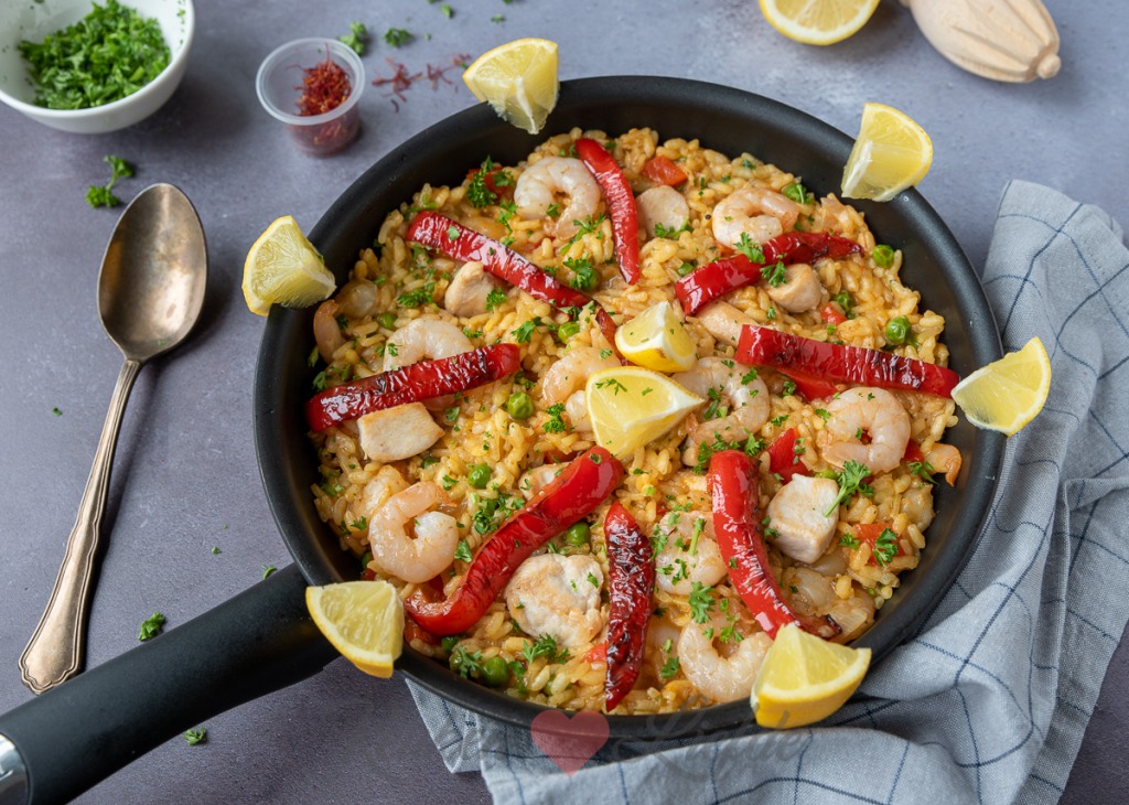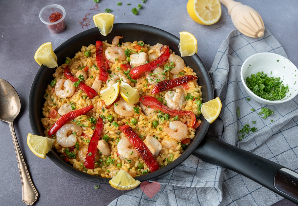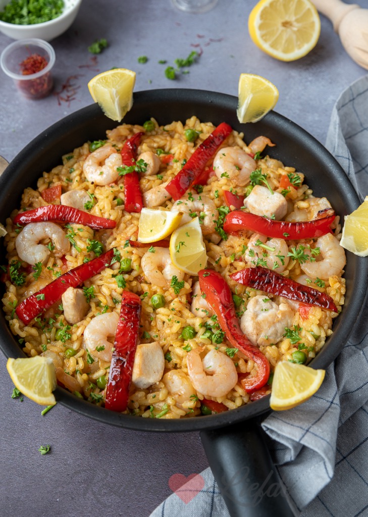Roer de helft van de kip, garnalen en peterselie door de paella. Garneer de paella met de overige kip, garnalen, peterselie en partjes citroen.