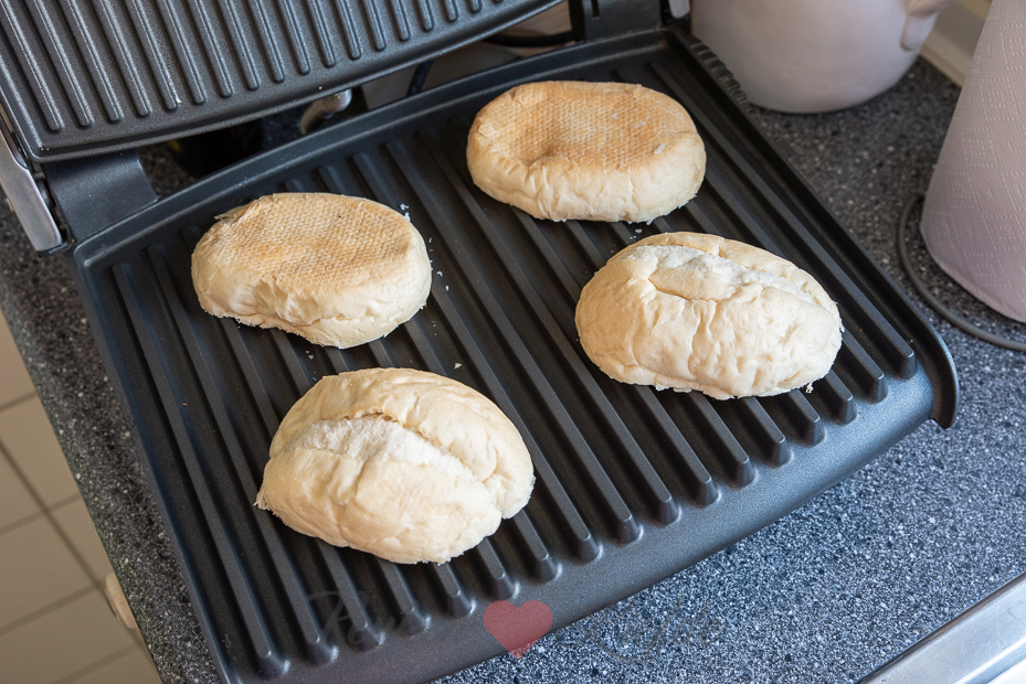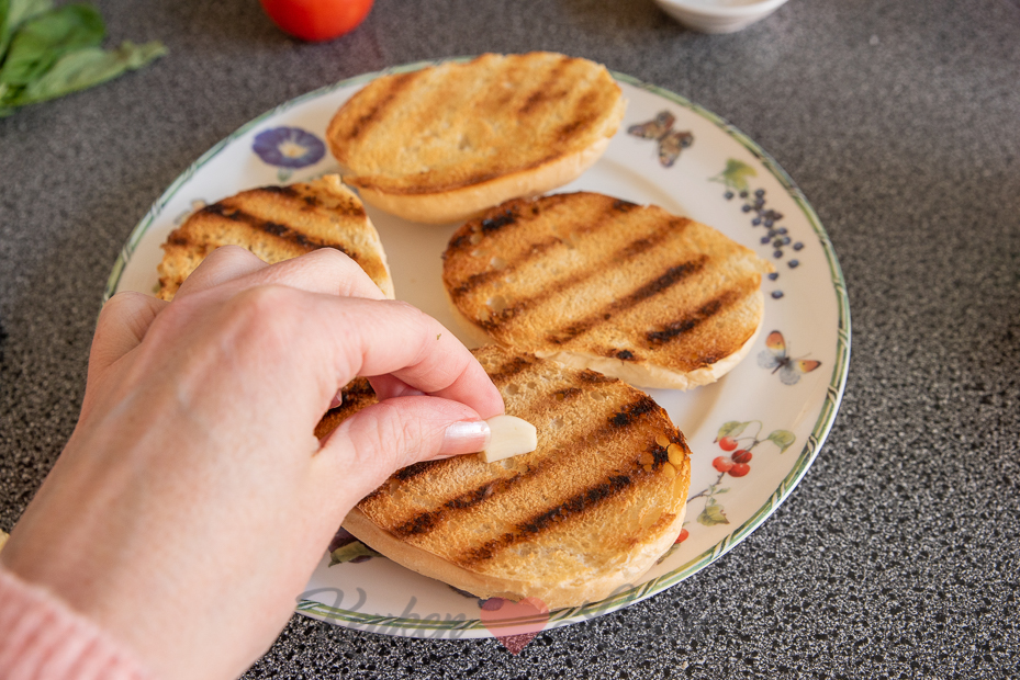 Verwarm de grillpan of het grillapparaat (je kunt de broodjes natuurlijk ook buiten op de barbecue grillen). Snijd de broodjes open en leg ze met de opengesneden kant naar beneden op de grillplaat. Grill tot ze goudbruine grillstrepen hebben. Wrijf de opengesneden kant van de broodjes in met een gehalveerd knoflookteentje, zo krijgen ze een subtiele knoflooksmaak.