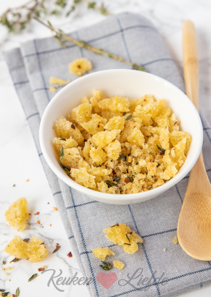 Restje oud brood over? Niet weggooien! Deze Italiaanse pangritata is de ideale kliekjesverwerker voor oud brood! In Italië gebruiken ze pangritata als krokante broodkruim topping om over gerechten te strooien. Ze noemen het ook wel Poor Man’s Parmesan omdat het een goedkoper alternatief is voor Parmezaan. Lekker om over pasta of soep te strooien!