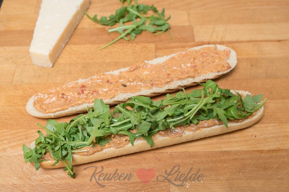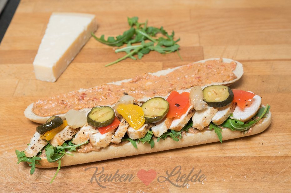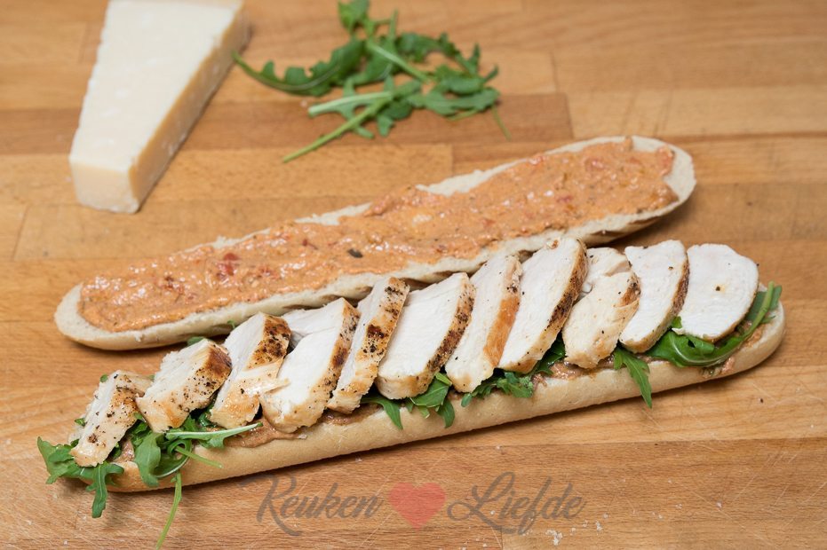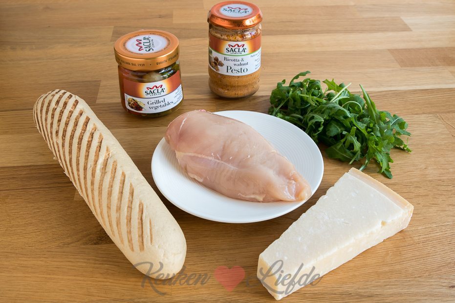 Snijd de panini open en besmeer beide helften royaal met pesto. Beleg de onderste helft van de panini met rucola. Snijd de kipfilet in plakken en verdeel over de rucola. Laat de gegrilde groenten uit het potje uitlekken en verdeel over de kip. Schaaf wat parmezaan over de kip en groenten en bedek met de bovenste panini.